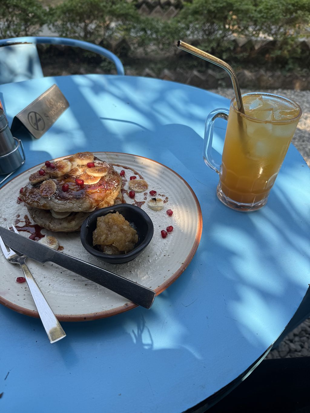 The place is by far the best we have been to so far in India. The smoothie bowl we took was huge and they have vegan, gluten-free pita bread and pancakes without white sugar but with date syrup. We had their homemade ginger ale too and a salad. We had 0 issues stomachewise and will be back for sure. The atmosphere is incredibly nice and calm. The garden is cosy and ideal for studying and working. Staff is friendly and easygoing and they have a nice terasse you can use during heavy rains too.