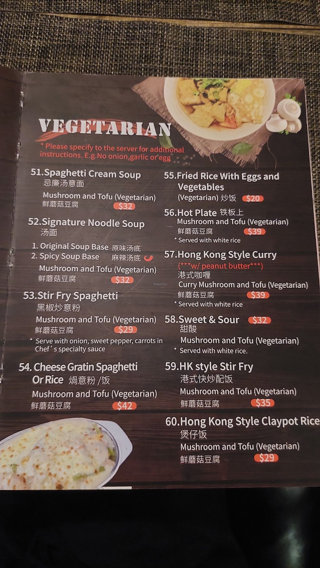Serves meat, vegan options available. Chinese restaurant & bar offering a few items that are or can be made vegan such as soup, stir fry spaghetti, rice, hot plate, curry and more. Open Mon-Sun 11:00am-10:30pm.