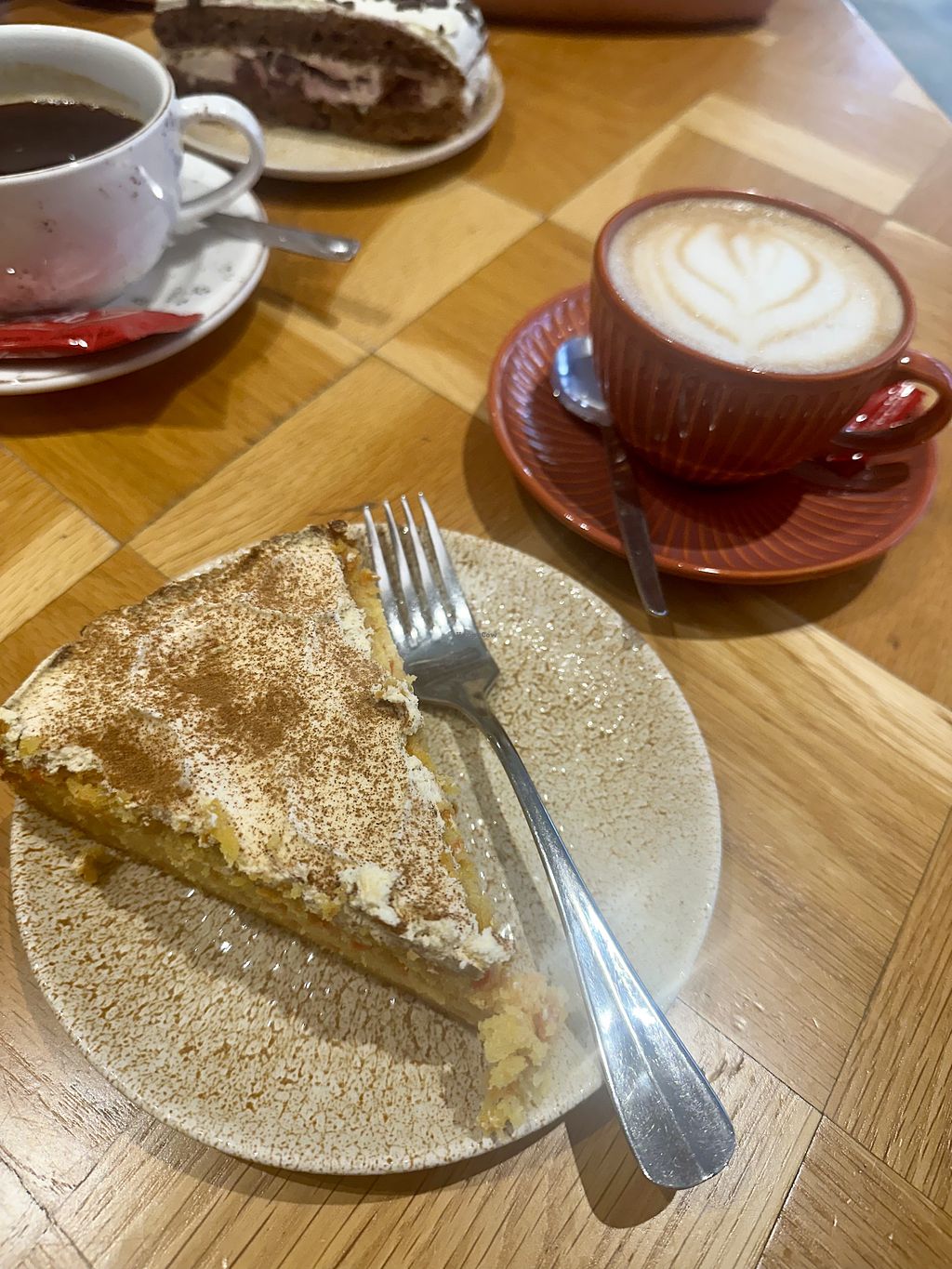 Read moreWe came along for afternoon coffee and enjoyed a coffee latte and a homemade chai latte and a carrot cake and a chocolate cake. We loved that they offer a huge variety of sweet and salty things (evrytging vegan :)) and 3 different types of plant based milk. The chocolate cake was really tasty and the coffee as well. Unfortunately the carrot cake was not so good, there was missing already some part of the cream topping by serving and the consistency seemed more like rubber. :/The chai latte was a little boring. For a home made one I really expected a little more than a bag of tea in a cup of oatmilk.