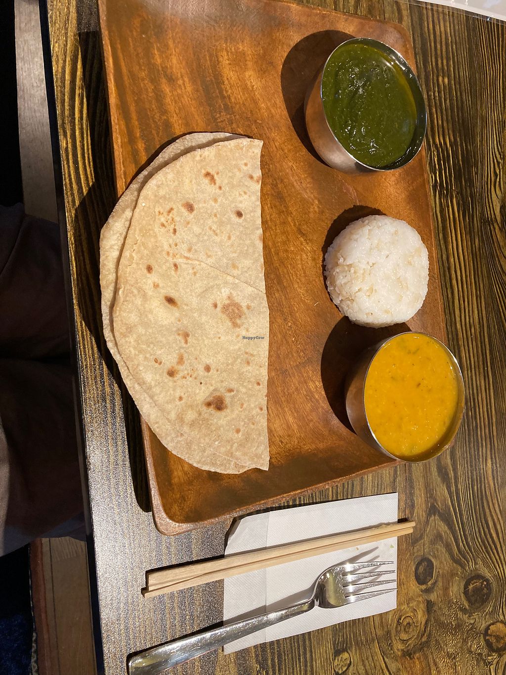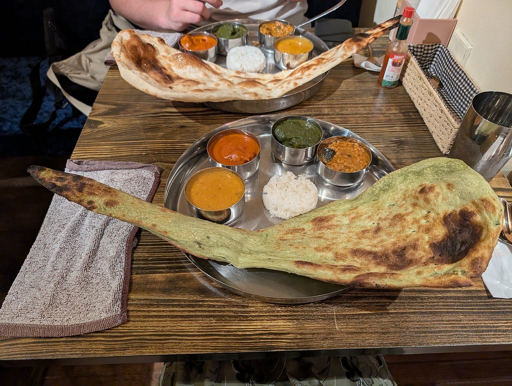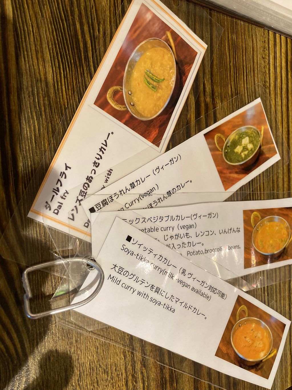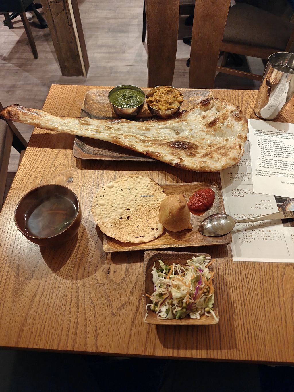 We walked by this restaurant a block from the Kawai Kanjiro house, a wonderful visit for pottery enthusiasts and for traditional Kyoto townhouse architecture. We are so glad we stopped in. We ordered the Namaste lunch set, with 2 choices of vegan curries, bread, salad , soup , a drink and a small dessert. Everything was delicious and easy to share. This restaurant is quiet and welcoming , the waitstaff speak English and there is an English menu. There is room for about 30 guests,with several 6 seat tables , so this would be a great place for groups. Spicing can be specified from mild to hot. We loved the naan and whole wheat paratha.