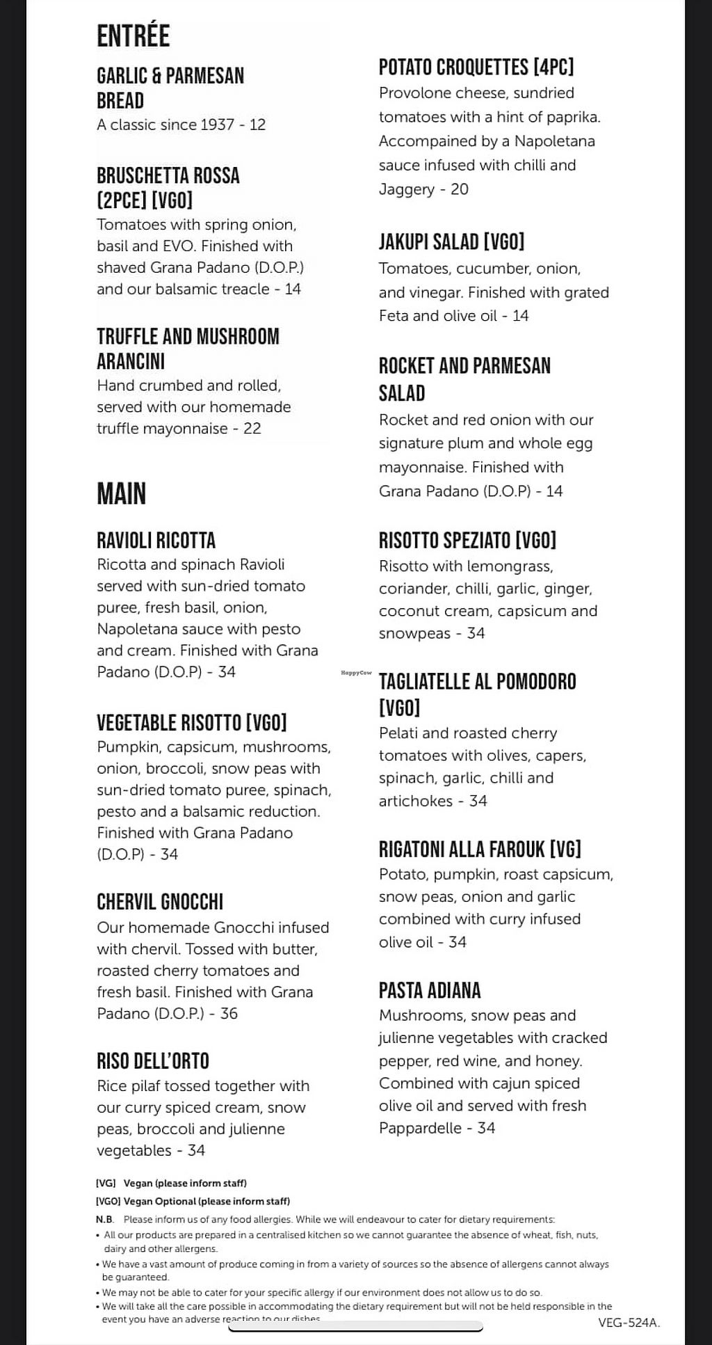 There were a few vegan options on the vegetarian menu - pasta, risotto, bruschetta and a salad. I ordered the Alla Farouk which is already vegan and it was delicious. It was spicy, unique and very filling. The entire menu is a bit pricey but they do not skimp on flavour or quality.