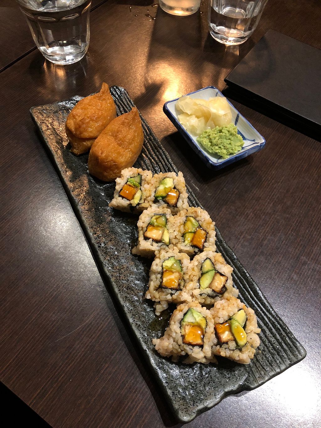 They have several vegan options and I went for the geisha roll. It was tasty and pretty but not super interesting ingredients in the end, and also very small portion for the price I think ($13-14? The menu is on their website) Might need some side dish to make it a meal. They have cheaper veg rolls ($4-6?) that seems a bit smaller so could also try those later. The lunch menu seems like a good deal ($10 for salad and spinach curry or tofu steak).