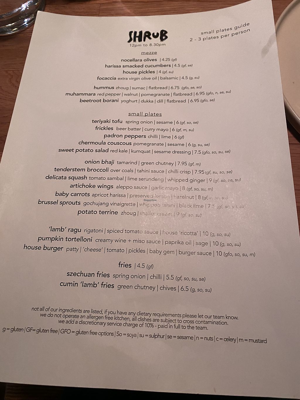 I am absolutely wowed!! Everything about Shrub is 10/10! The decor, the atmosphere, the staff, the food, all outstanding! This is probably one of the best vegan restaurant we have ever been! The food was outstanding! We had the pumpkin tortellini, burger, tofu, artichoke, fries and cambert! And finished off with cookie dough!!! The pumpkin tortellini was amazing! Will definitely be returning for this alone!!! My husband said the burger was fab! We enjoyed everything but out of the little dishes the tofu was a favourite!