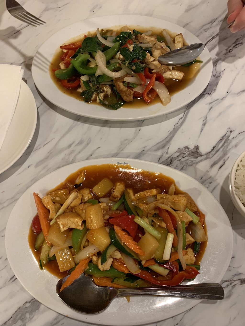 Our stir fry entrees we’re delicious! Nothing is explicitly vegan in the menu, but the waitress told us that almost everything can be made vegan. A lot of the dishes that seem like they would be vegan actually have fish and oyster sauce. Fortunately, their menu is very clearly labeled with ingredients and we were able to order entree without the non-vegan ingredients.