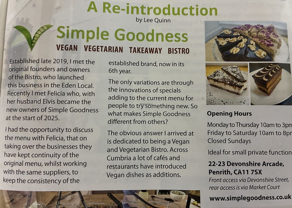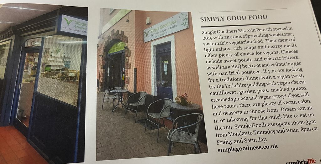 It was a great pleasure to fine Simple Goodness during our visit to Penrith. The food was amazing, the service great and such a friendly atmosphere. Unfortunately we don't live nearer, we would certainly be regular customers!