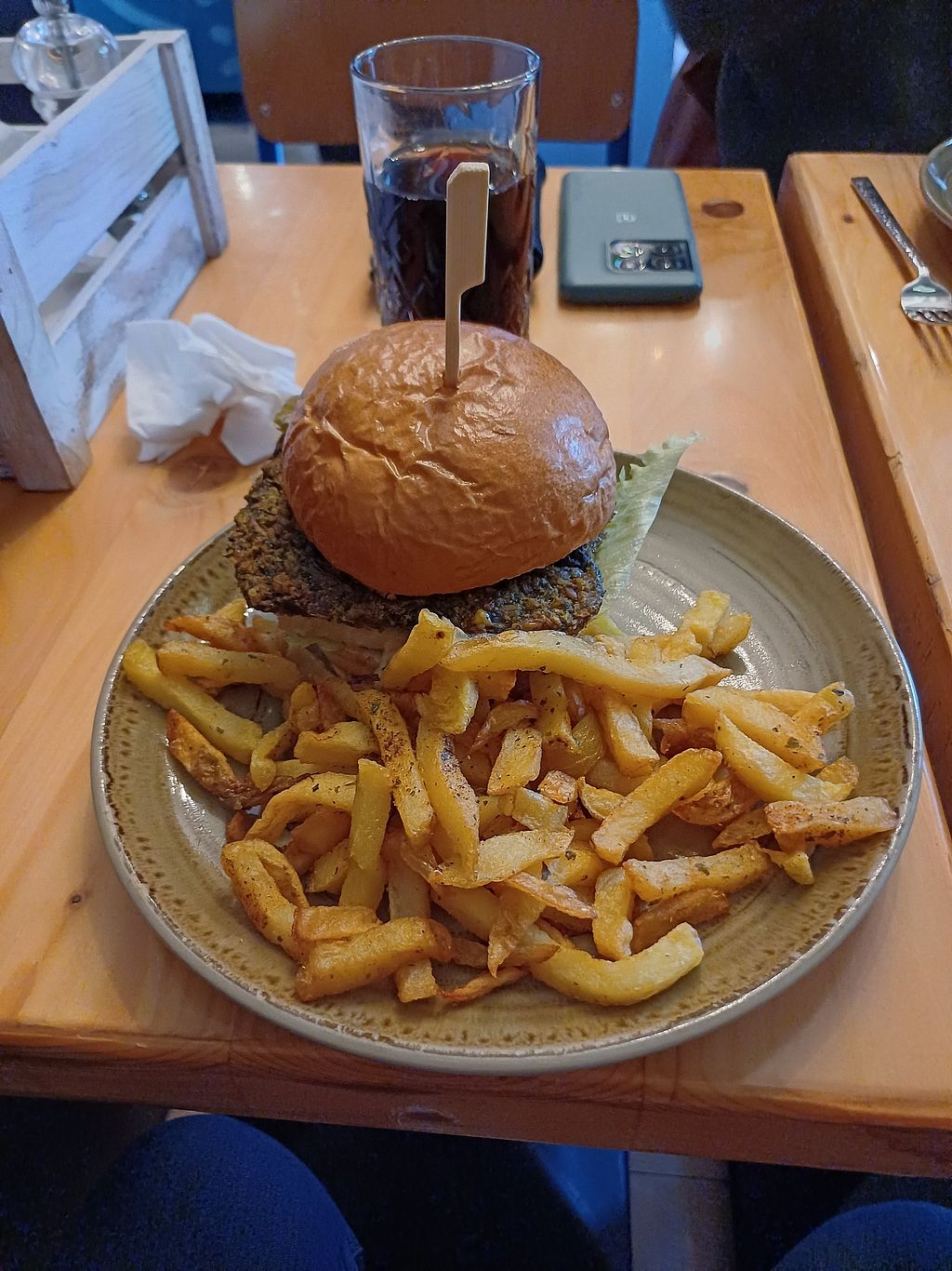 Very tasty vegan burger made from SEAWEED, MUSHROOMS, SPINACH AND HEMP SEEDS, TOMATO & VEGAN TARTAR SAUCE. Fries were ok, not great. But very much enjoyed the burger.