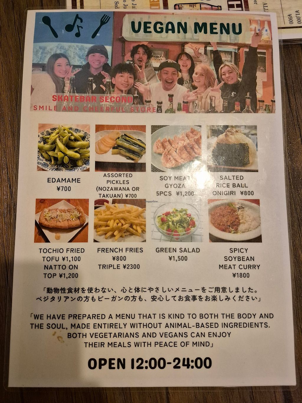 Serves meat, vegan options available. Izakaya (Japanese bar and restaurant) offering vegan choices that include gyoza, keema curry, fried tofu, onigiri, edamame, pickles and salad. Open Mon-Sun 5:00pm-12:00am.