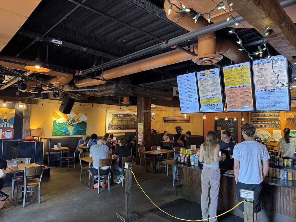 Went for Sunday brunch. Place was busy but there was plenty of seating, both indoor and outdoor. Good vibe. Looks like they are set up for live music outside, which would be great on a balmy summer evening. I had “The Vegan” which had seitan and vegetables and vegan cheese on a buckwheat crepe. Also a vegan chocolate milkshake. All very good. The menu indicates that you can have any of the crêpes created with vegan batter, but most of the other ingredients appear to be non-vegan. Note also the hallway to the bathrooms features an endangered species 270 degree visual and audio experience. Check it out!