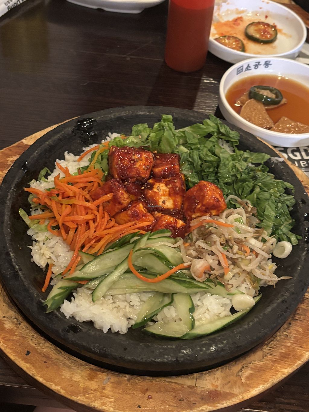 Serves meat, vegan options available. Restaurant serving vegan options like tofu bibimbap (mixed vegetables and rice; request no egg and no meat), vegetable bibimbap (mixed seasoned vegetables over rice; confirm no egg), japchae (Korean glass noodles with vegetables; request no beef and check sauce), edamame, and ddeokbokki (spicy rice cakes in red chili sauce; confirm no fish cake). Open Mon-Sun 11:30am-9:30pm.