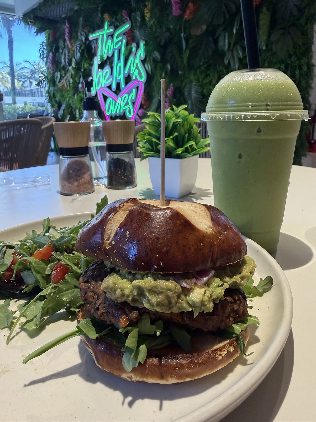 Opted for their signature burger with a side arugula sandal and was not disappointed. Delicious house made superfood patty on a pretzel bun. Go Green juice keeping it healthy, also delicious.