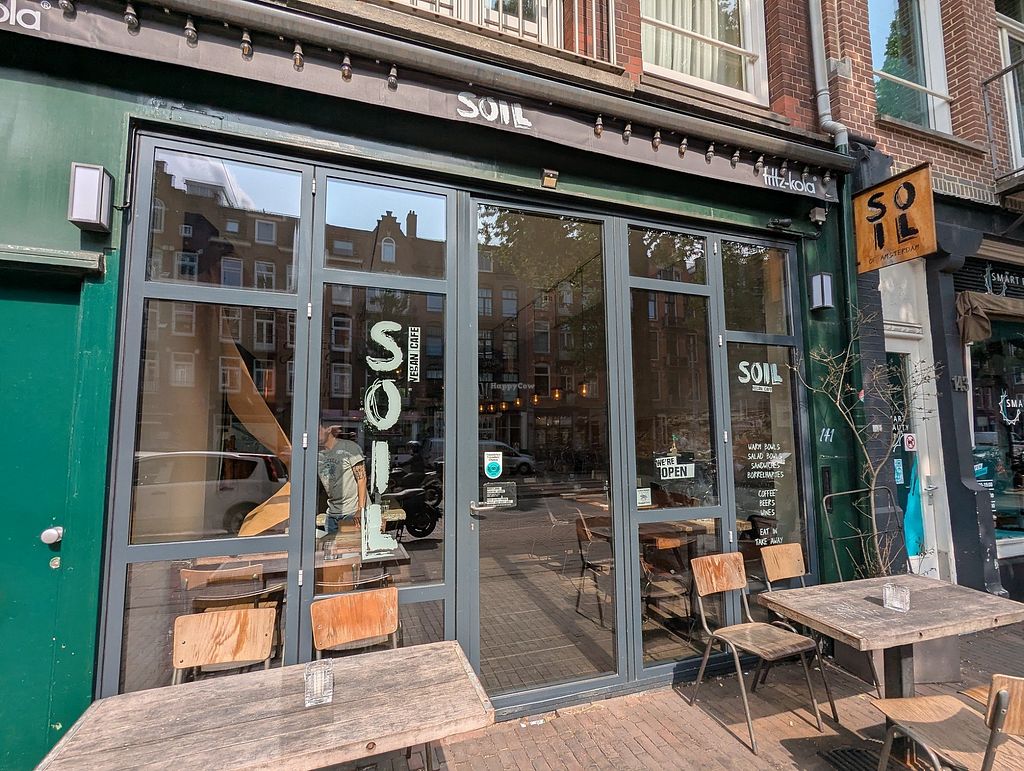 Soil Vegan Cafe is a typical vegan place: it’s small, cozy and idealistic. It’s open for lunch and dinner, has indoor and outdoor seating. And because it is located in Amsterdam, it’s heard to reach by car and impossible to park nearby. The menu is available in Dutch and English. While we were there, the staff mostly spoke English and only knew a few words of Dutch.