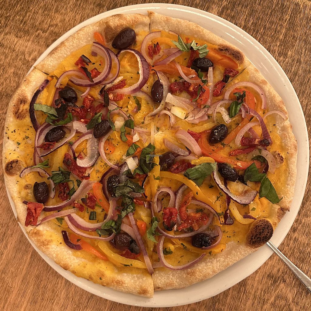 Serves meat, vegan options available. Pizzeria with 12” stone-baked pizzas. Offers vegan crusts and a wild mushroom pizza (minus the cheese.) NOTE: Reported November 2024 to have limited vegan options – please send updates to HappyCow. Open Tue-Thu 11:30am-8:00pm, Fri-Sat 11:30am-9:00pm, Sun 11:30am-8:00pm. Closed Mon.
