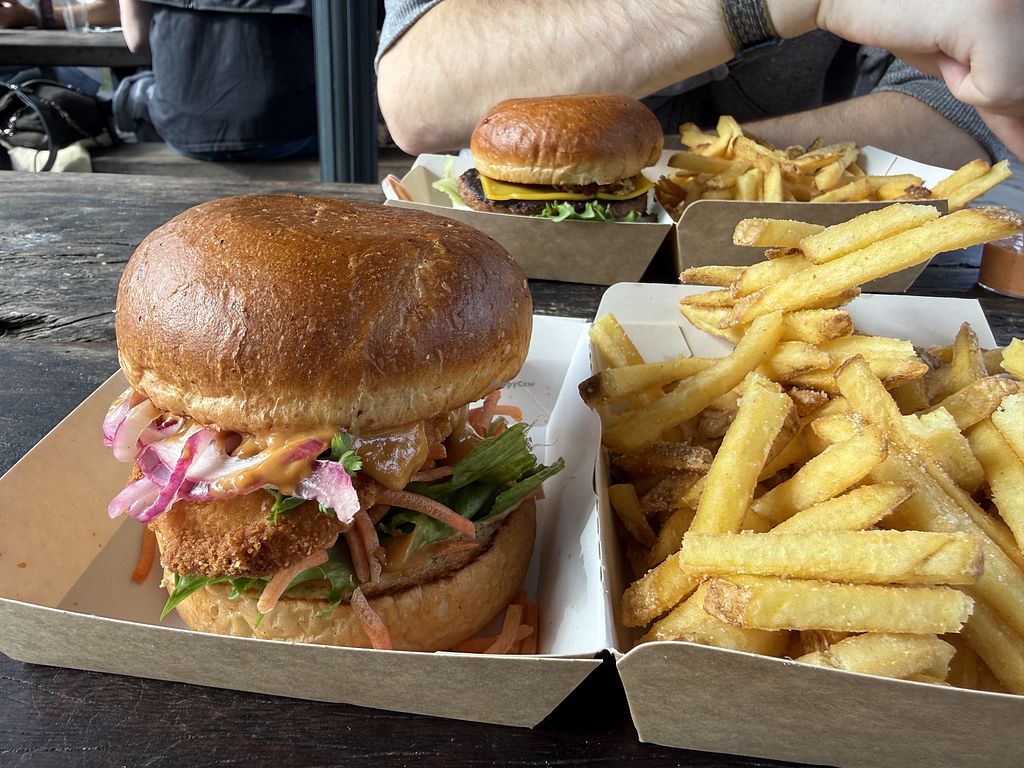 A small kiosk doing two types of burgers, a bbq one and a spicy chicken, both very tasty and filling. The portion of fries is very very generous, I recommend you getting a dip with it (truffle mayo, sriracha mayo, ketchup or barbecue sauce). Make sure you mention if you are allergic to peanuts as the sauce in the chicken one is made with peanuts. The guy at the kiosk is very friendly, wait time is maybe 7 minutes and you are surrounded by a food court, the vibe is really cool
