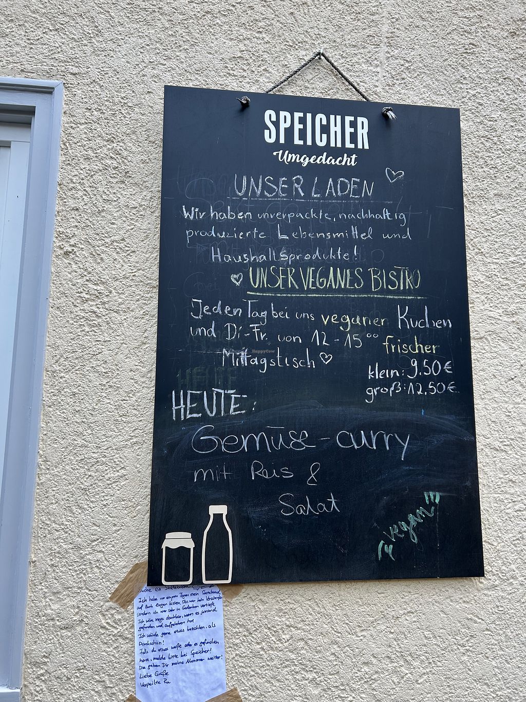 Located in the middle of the old town, the "Speicher" offers bulk groceries from produce, masala chai, "Nussecken", gummi bears to soap, seitan fix and flour, pretty and useful upcycling items and a daily lunch plate. Staff are friendly and eco-minded. The concept is simple: Bring your own container, weigh it, note the weight, put in what you need, then pay for everything at the register. If you forgot a jar or bag you can pick one of the jars that have been washed and weighed already.