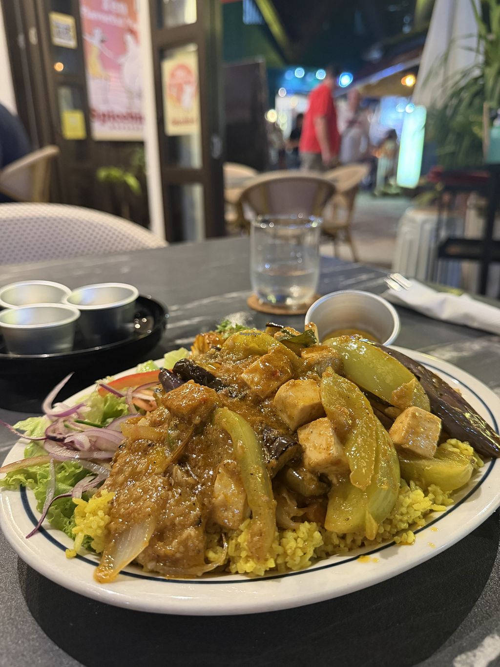 I ordered Eggplant & Squash Board (Vegan), which is based on the description it's lightly grilled eggplant and sweet squash with spice rice, side salad, grilled corn, and milk roll. I really like the taste of it, even my non vegetarian friend liked my order.