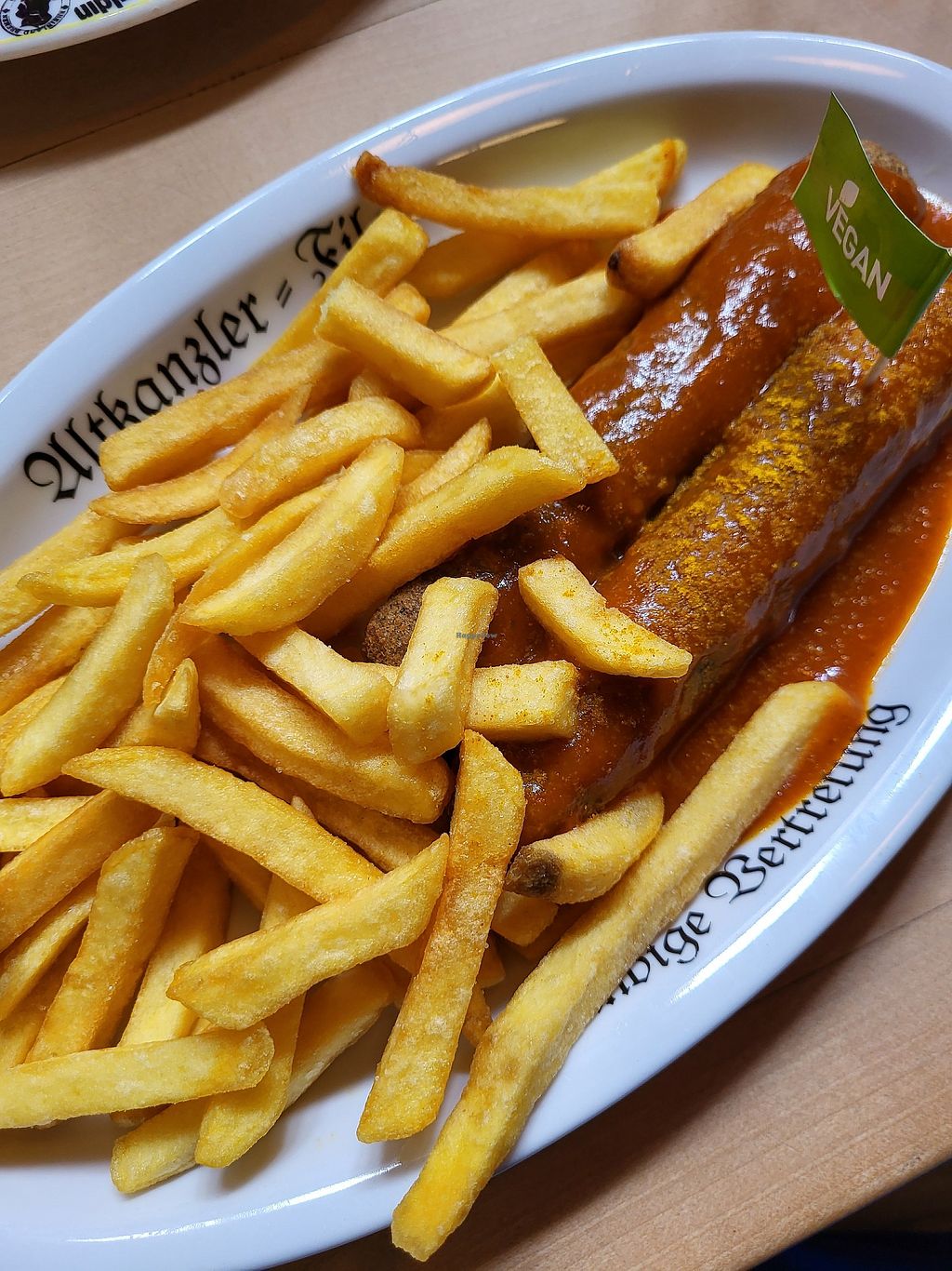 Ich hatte die Currywurst (große Portion), es gibt ansonsten noch veganes Curry, Flammkuchen, Ofenkartoffel, Salat. Also wirklich viel Auswahl.