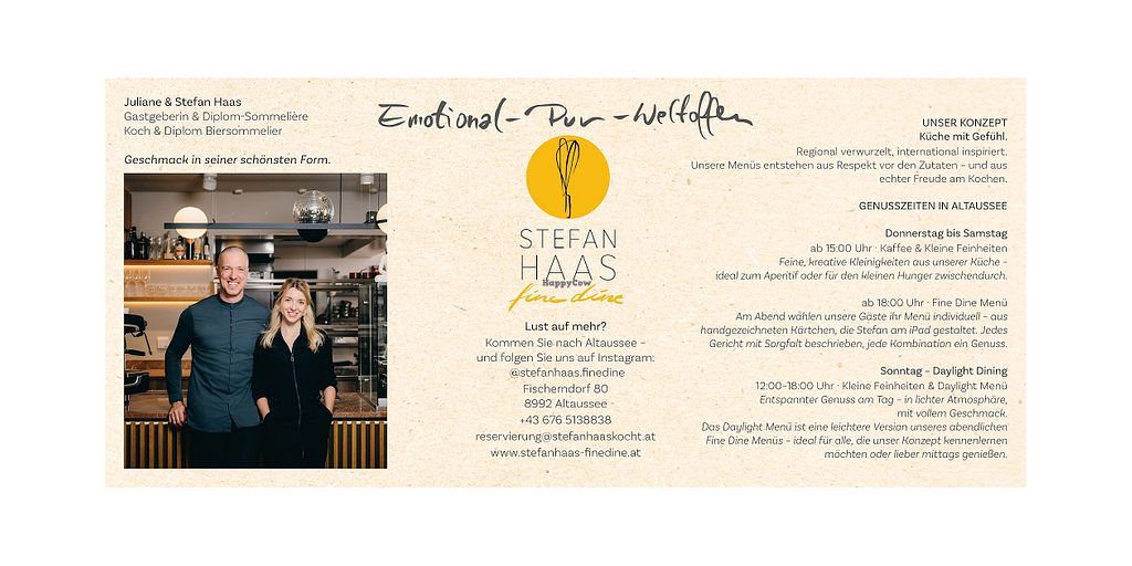 Serves meat, vegan options available. Fine dining restaurant with a focus on regional ingredients. Offers vegan set menus and à la carte dishes. Open Thu-Sat 15:00-23:00, Sun 12:00-18:00. Closed Mon-Wed.