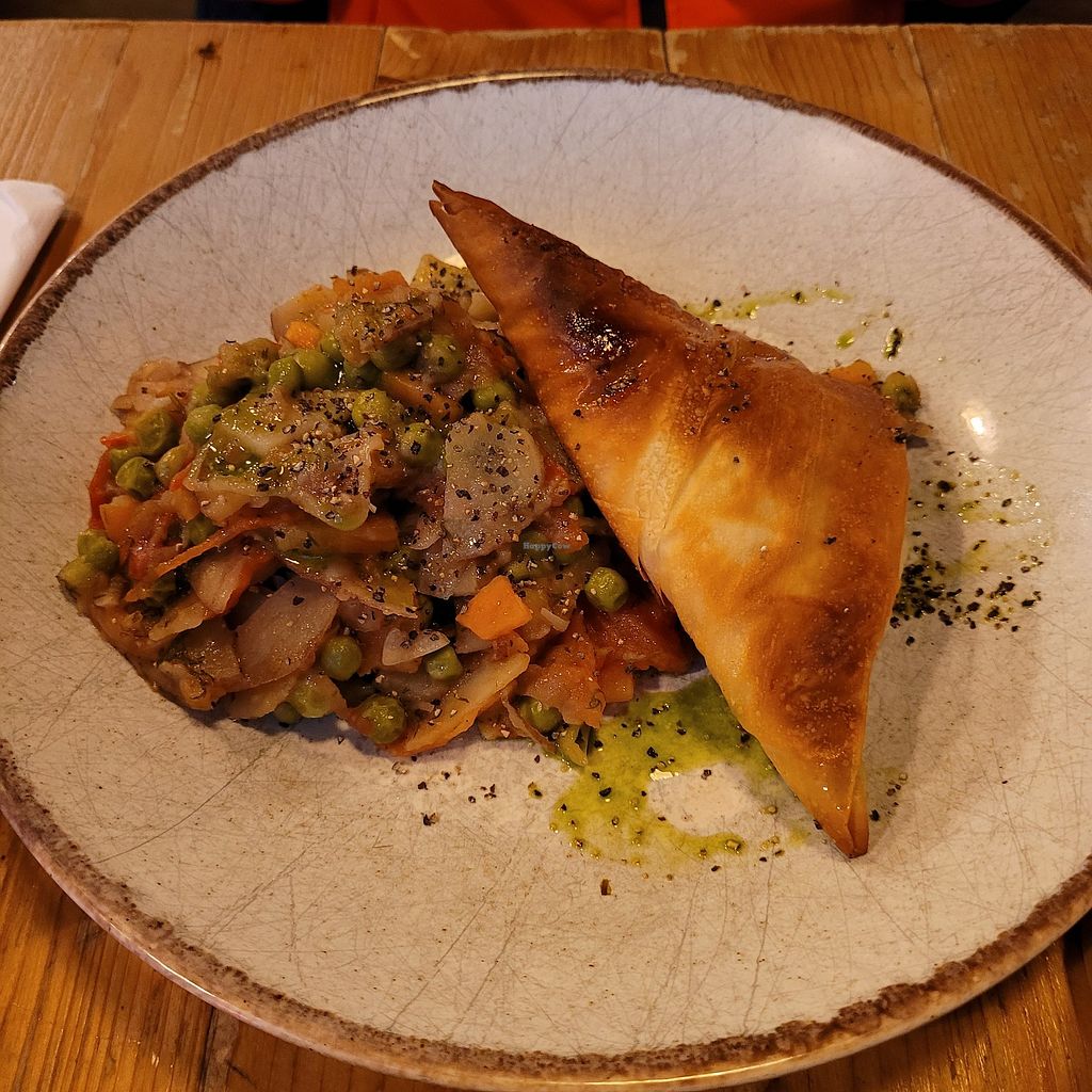 Main with samosa and peas & carrots in tomato sauce