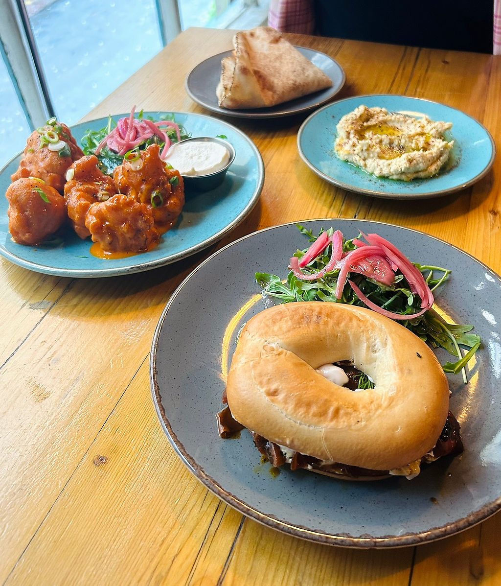 Hummus plate, buffalo cauliflower, carrot lox bagel