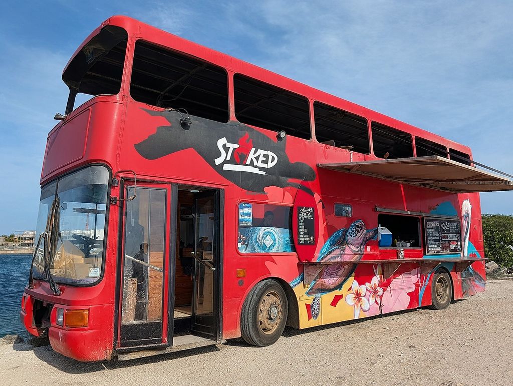 Serves meat, vegan options available. Double decker food truck. Has 3 vegetarian choices that can be made vegan. Owner knows what plant based/vegan means. (Appears they do not have their own social media site(s).) Open Mon-Sun 12:00pm-8:00pm.