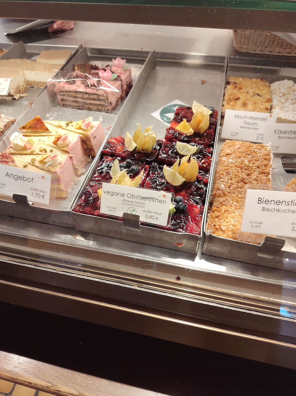 Walking into the shop feels like walking into a very traditional German bakery, a place you wouldn't expect would sell anything vegan. However, they had at least two vegan cake sorts to choose from, cakes that looked just as impressive as the non-vegan cakes. They also had some vegan products on their shelves. It is fair to say that I was caught by surprise. The cake was also really moist and sweet.