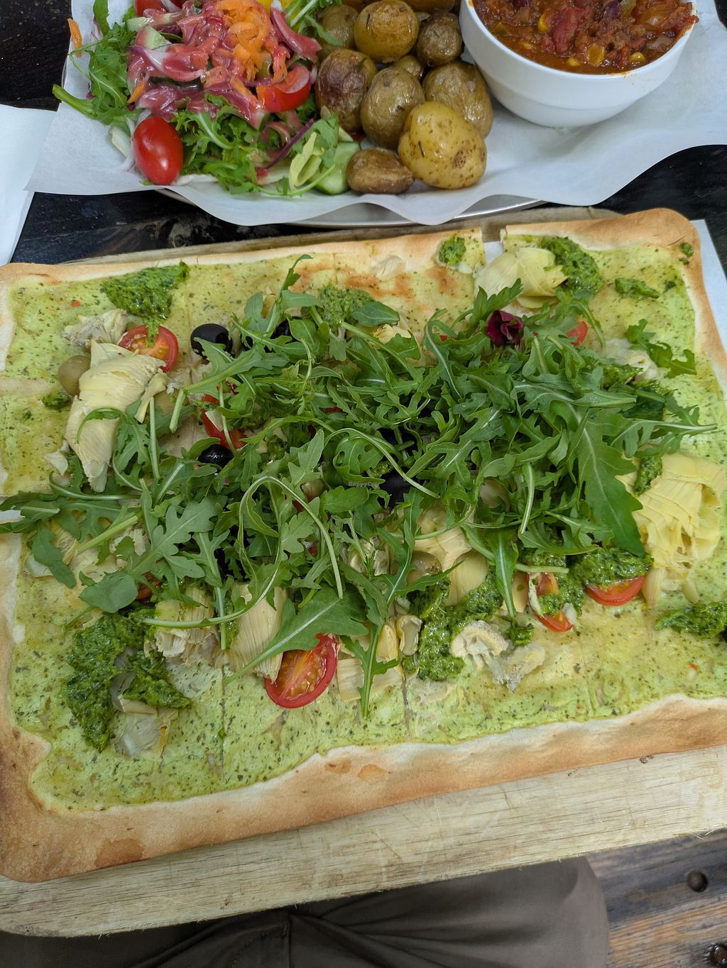 I had the Kizza which was a huge and delicious thin crust pizza with many vegetables. The vegan sour cream and pesto topping was delicious. I’d like to go back and try more of their options