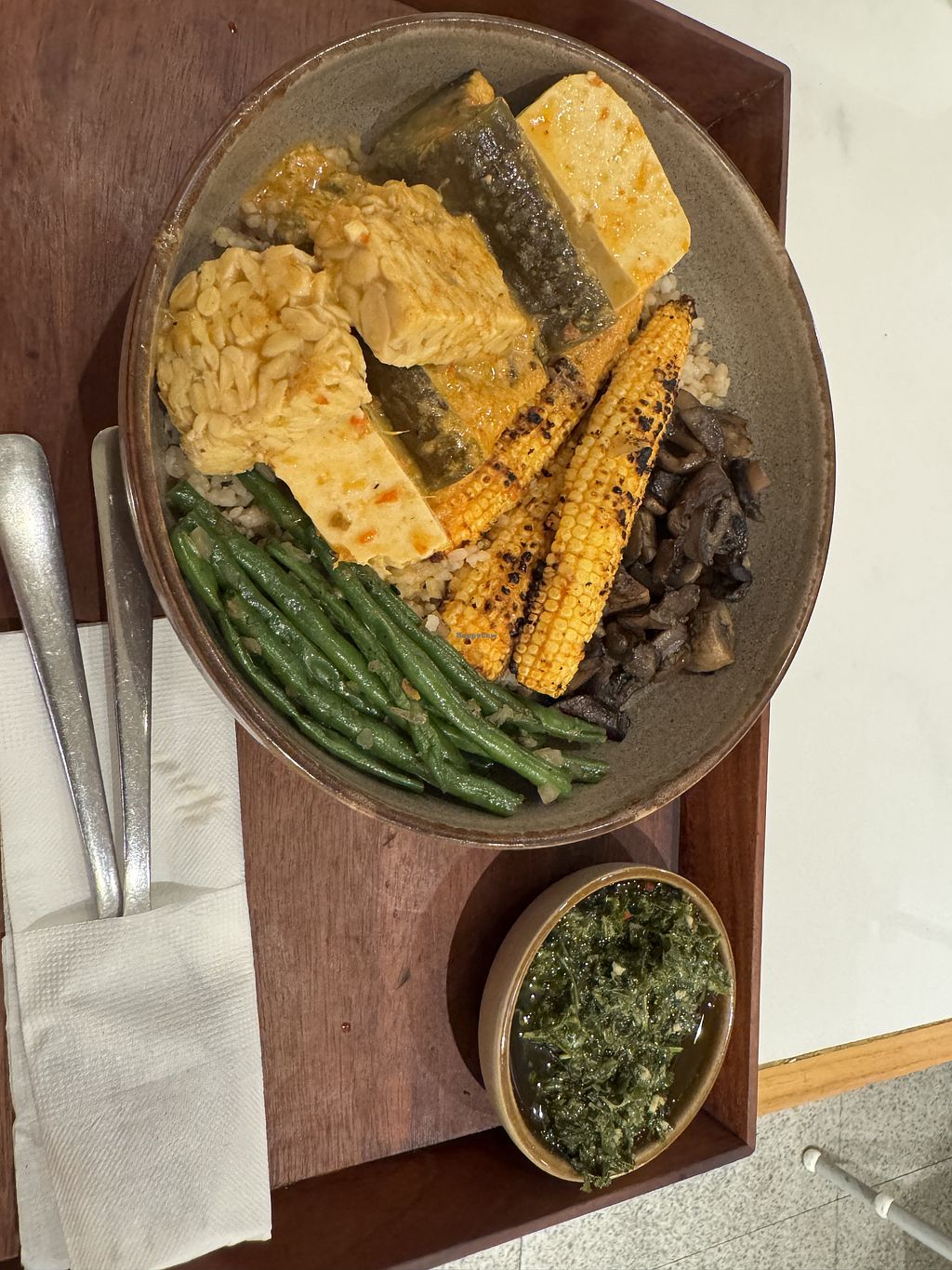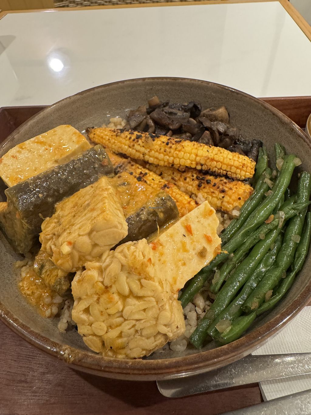 Serves meat, vegan options available. Health food restaurant in the mall. Has a build-your-own bowl concept where you choose a grain, a protein, 3 sides/vegetables, and a dressing. The sauces are vegan except for kuro sesame and black pepper emulsion. Open Mon-Sat 10:00am-8:00pm.