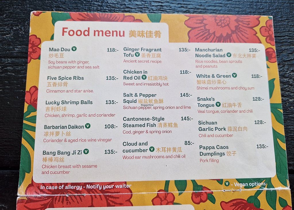 Serves meat, vegan options available. Chinese restaurant where you could get meatless dishes, like the fried tofu, silk tofu with eggplant or tahini, and others - ask to veganize. Each dish is served in a little bowl. To ensure a seat reserve one week ahead. Chinese decor with porcelain. Please note that many businesses in Sweden are cashless. Open Tue-Sat 17:00-21:00.