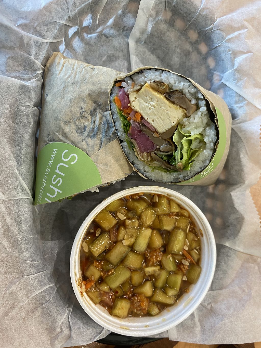 Cute local spot, the food was delicious!! I got the veggie sushi burrito and added tofu, and a side of Asian cucumber salad. They also have teas and kombucha. Yummy food, good options, and kind and knowledgeable staff