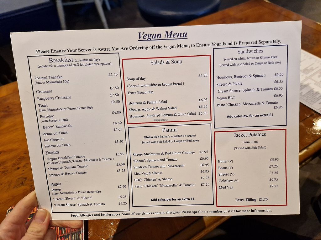 Serves meat, vegan options available. This cafe has a separate vegan menu that includes sandwiches, jacket potatoes, and panini with plant cheese. Offers vegan afternoon tea option. Open Mon-Fri 09:00-16:30, Sat 08:00-17:00, Sun 09:00-17:00.