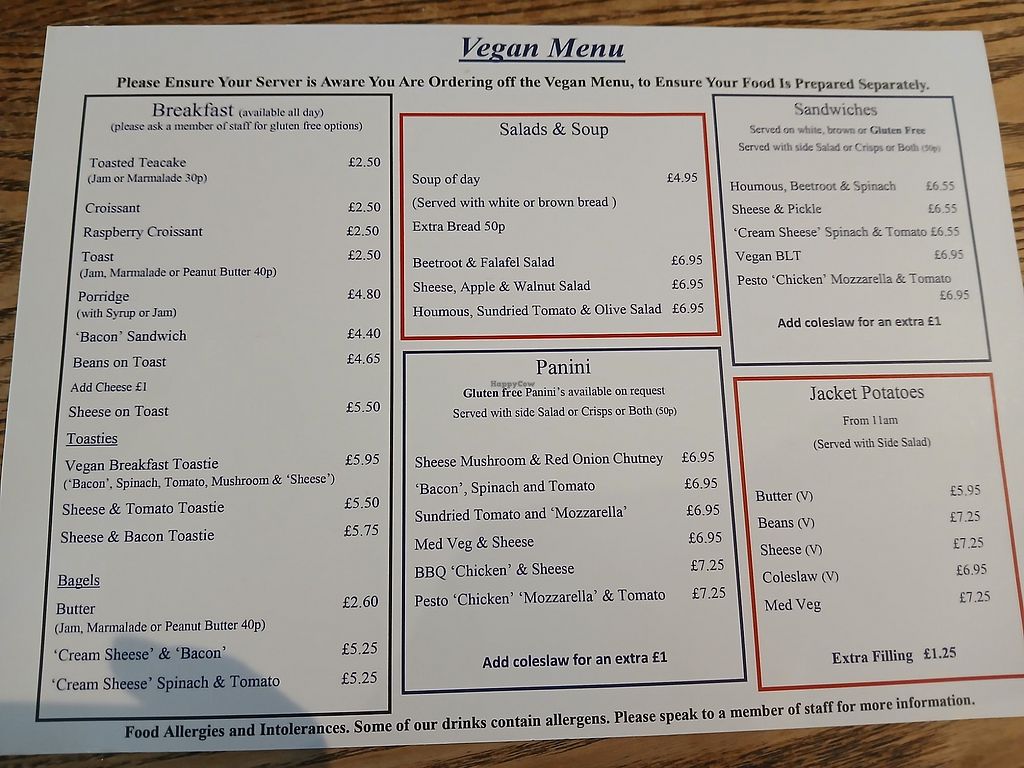 This little cafe has a great separate vegan menu with paninis, toasted sandwiches etc. Lovely plant milk hot chocolate and even offered a taster first so that we got what we wanted. Good choice of vegan cakes too. The staff were really friendly and helpful.