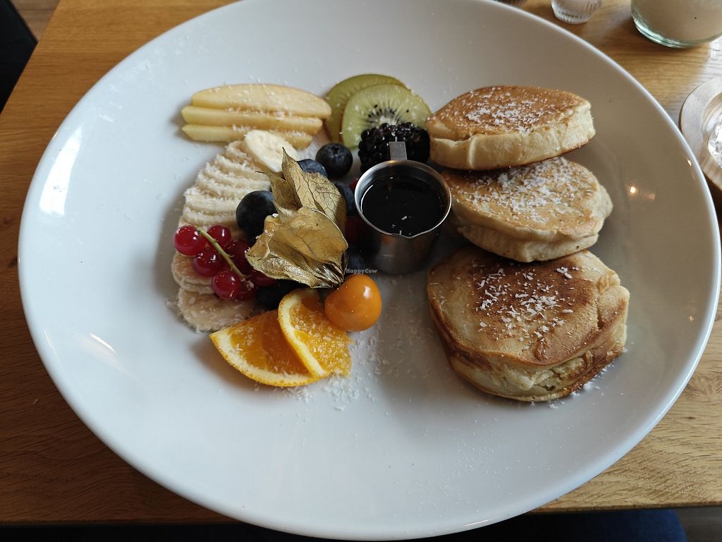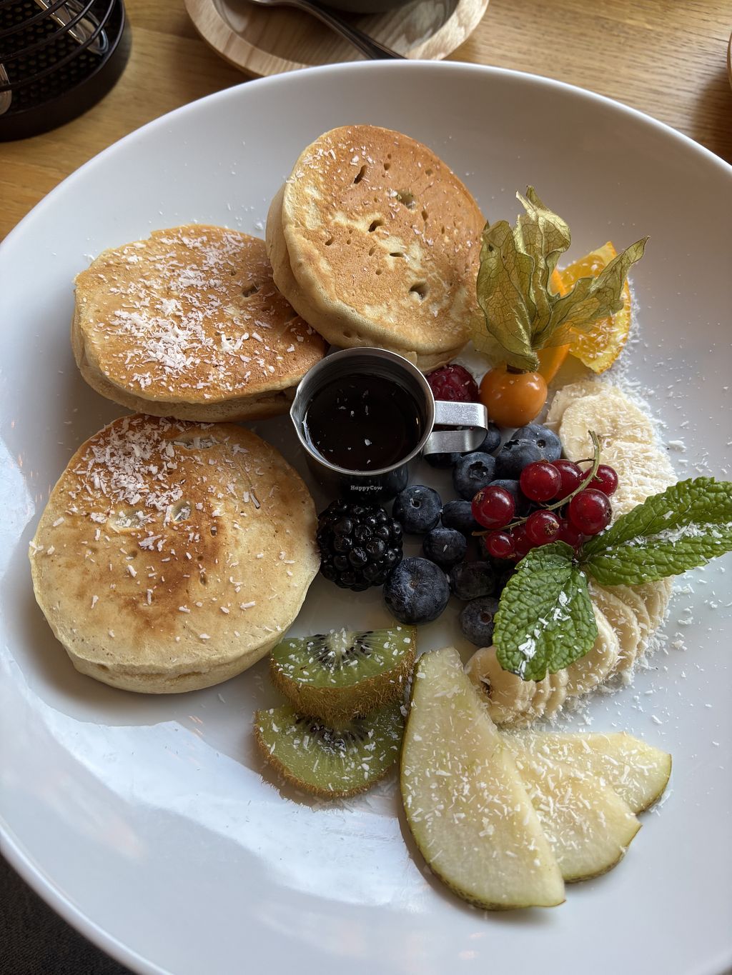 Açaí Bowl with coconut milk, vegan pancakes and white chocolate with c…