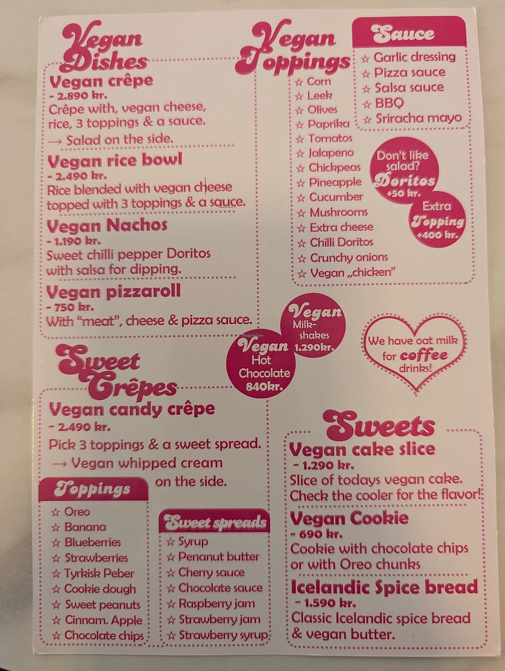 Cons: The vegan menu is only in Icelandic and hidden, Too big portions to get both savory and sweet crep, Outside seating is too low to eat comfortably
