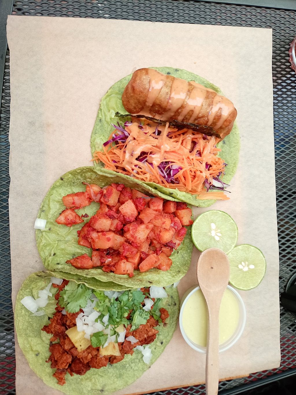 Offers vegan tacos, burgers and desserts. Breakfast served Fri-Sun. Courtyard setting out front. Est. 2017. Open Wed-Fri 2:00pm-9:00pm, Sat 9:30am-9:00pm, Sun 2:00pm-9:00pm.