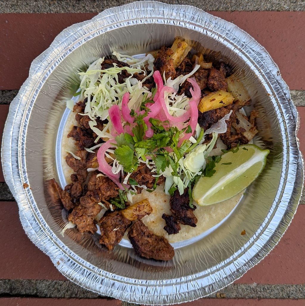Serves meat, vegan options available. Taco cart with clearly marked vegan choices which may include a burrito, quesadilla, salad, taco, and torta. Open Mon-Sun 11:00am-7:00pm.