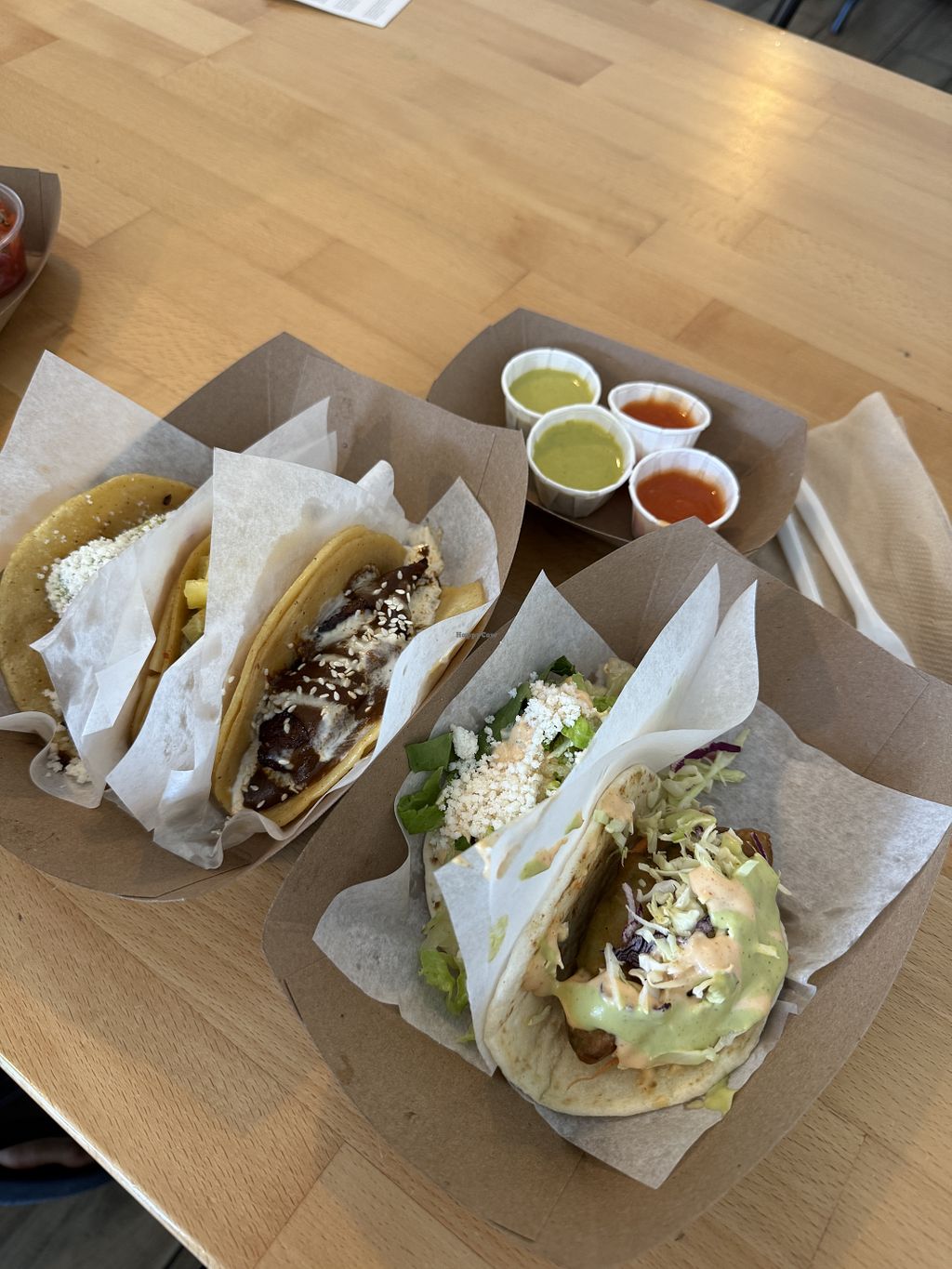 Super friendly staff really good tacos… but maybe avoid the beyond meat if your not a fan of that. The chips were also really yummy. Best vegan place I’ve been to in a while.