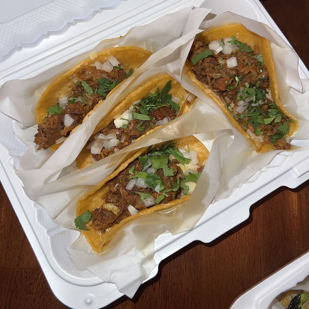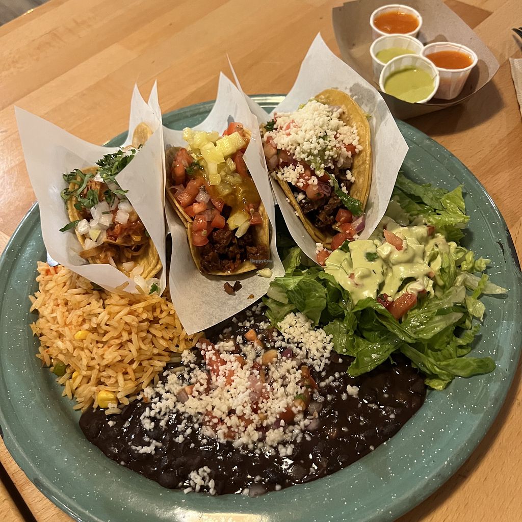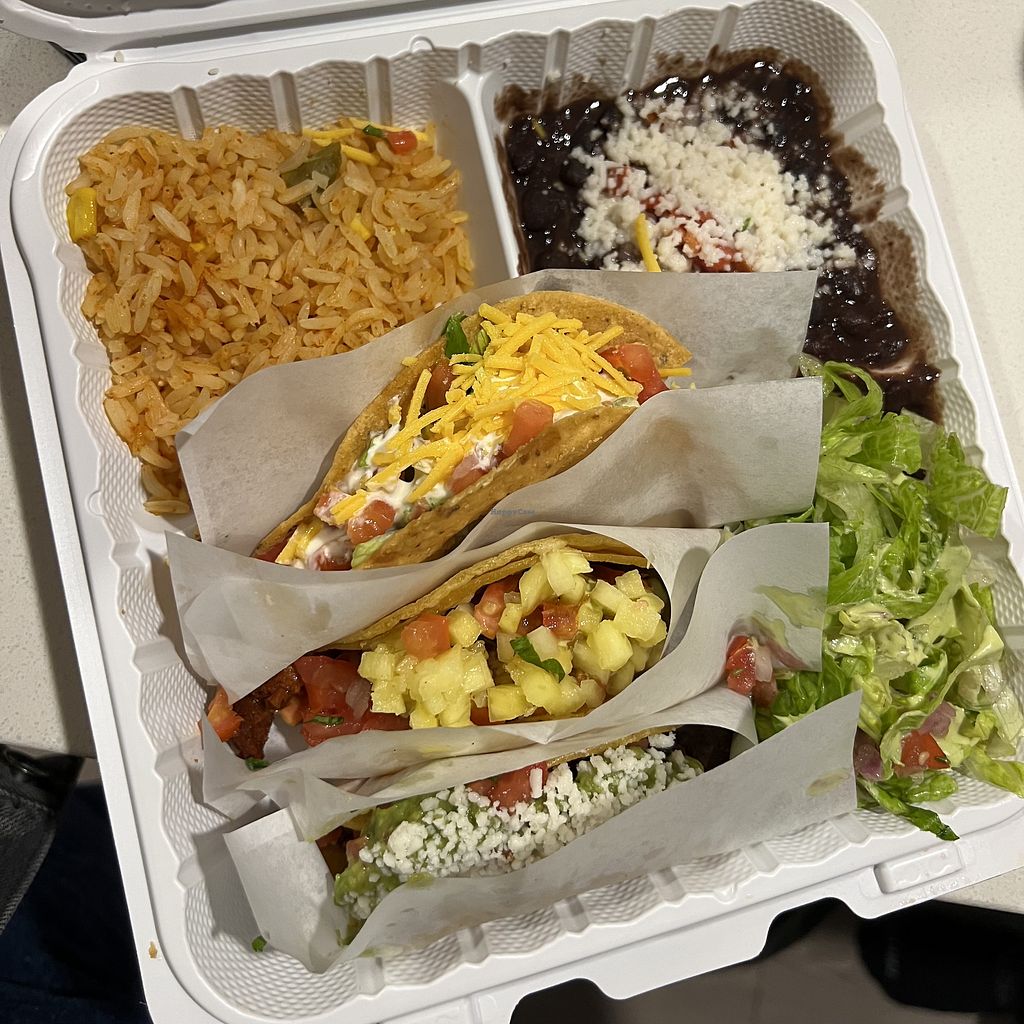 Taco platter-top rice & beans, middle Barbacoa, bottom mushroom asada