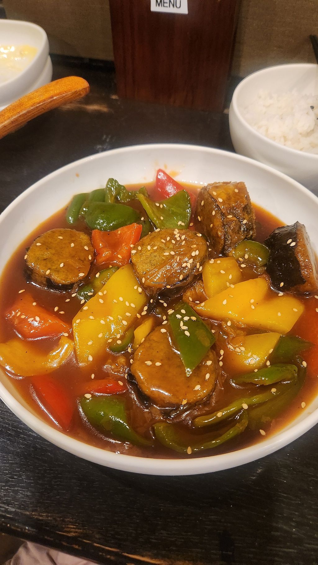 Fried mock meat meals are so good fried rice (chahan) is delicious. But ramen is a bit bland (taiwanese style taste). If you can eat numb chili (mala) don't miss mabo tofu for any reason
