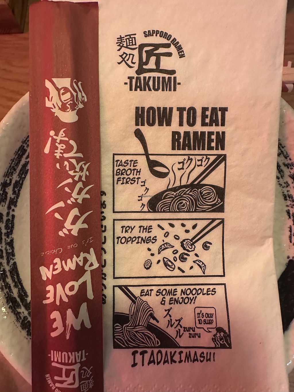 My first time at Takumi and it was delicious. Went there two days in a row. Would definitely recommend, especially if you’re vegan and love ramen. It’s affordable and the flavors and toppings are delicious! Value for money is good. The service was quick and it’s a nice place to sit. Just wish there were more vegan side dishes too!