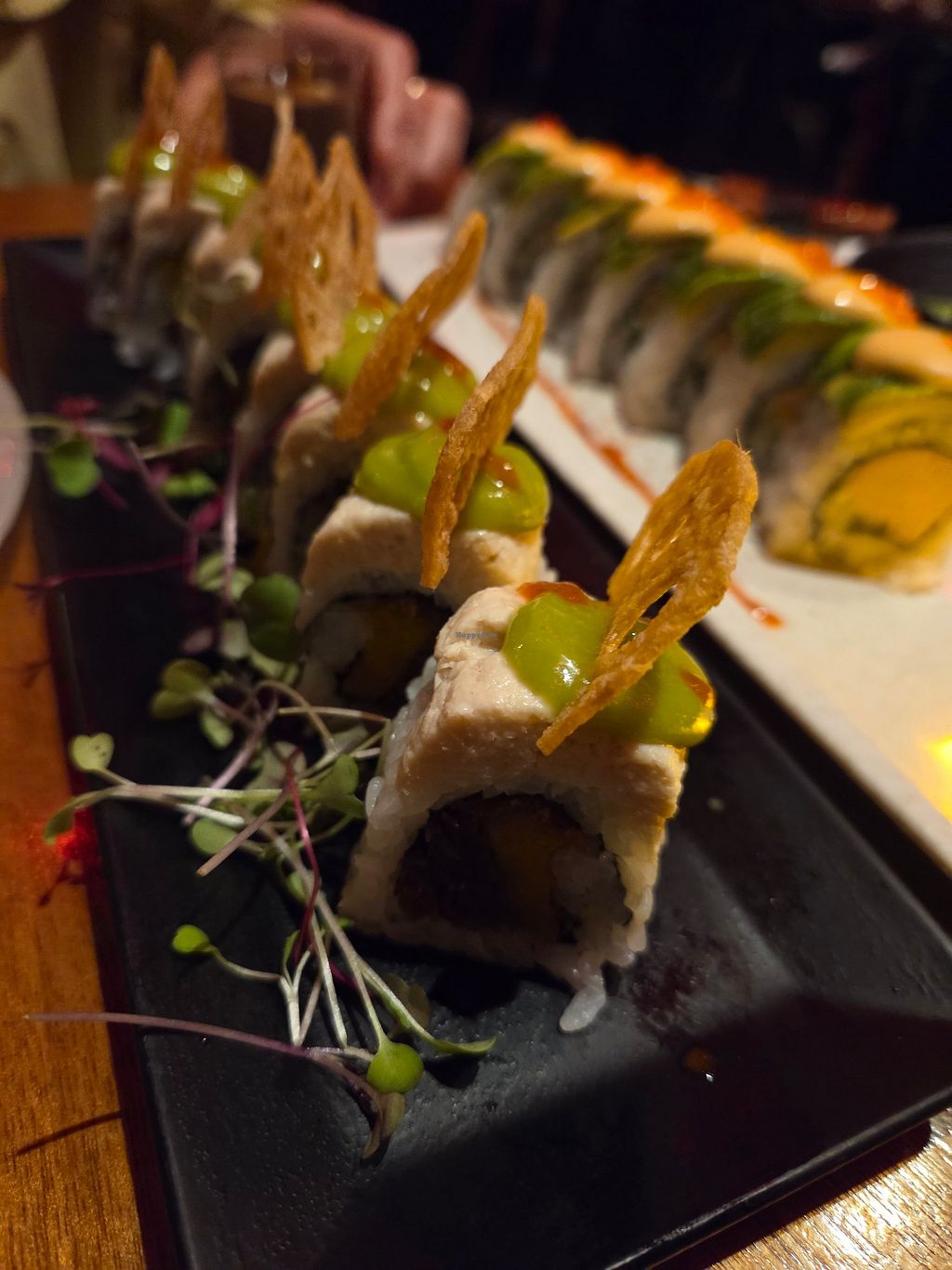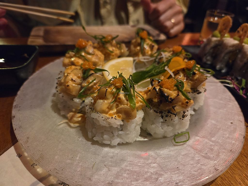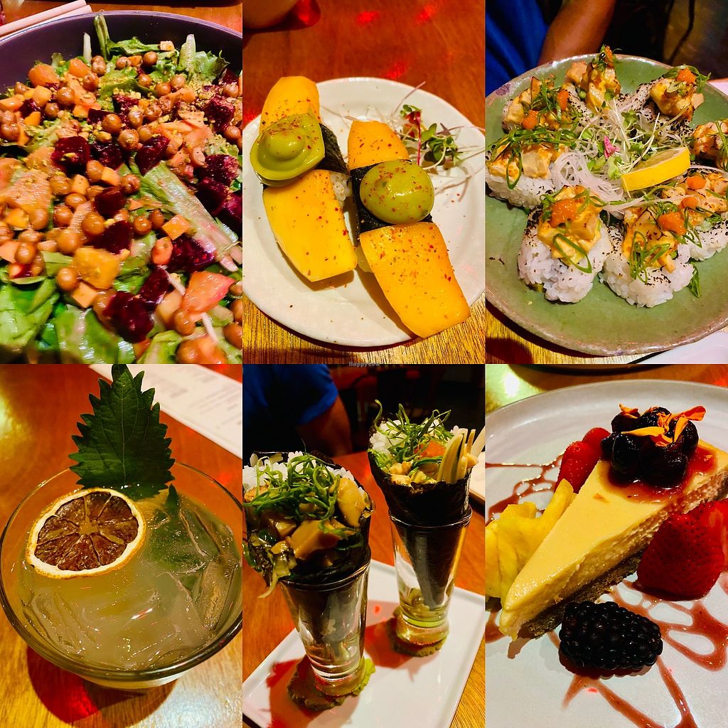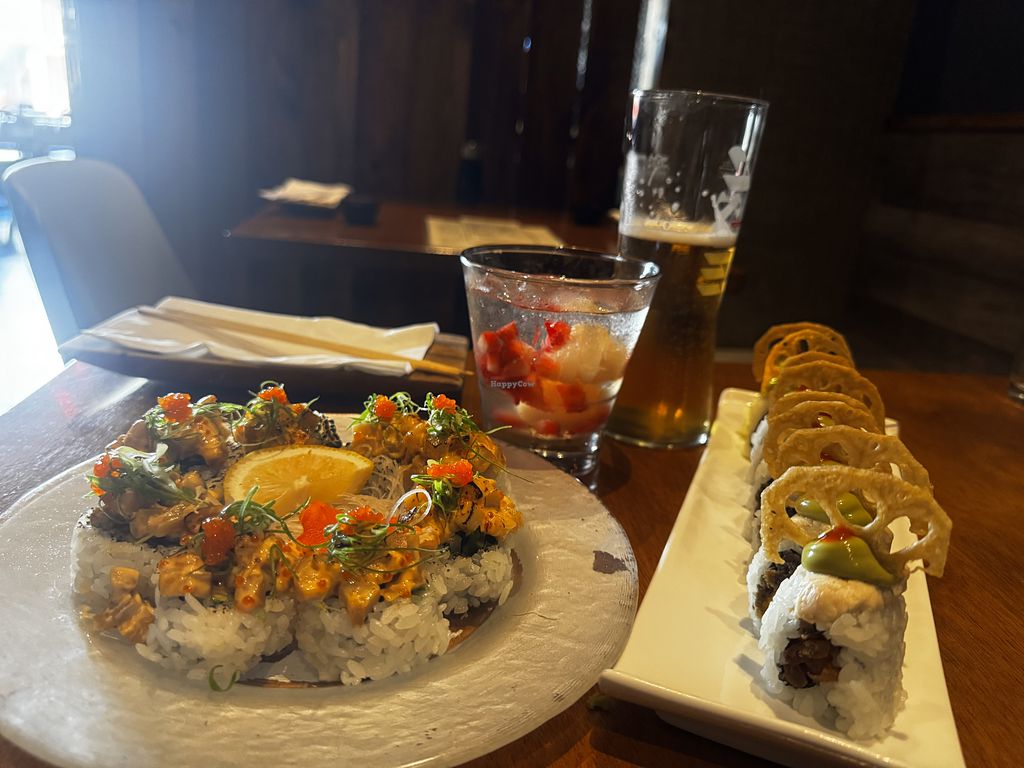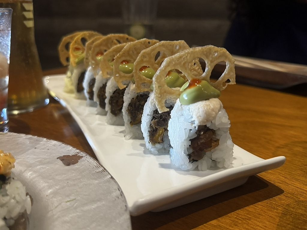Fully vegan sushi experience. We enjoyed it and would recommend it. If you're a sushi buff you may be disappointed in the flavors and textures of the roll. A bit pricey, but interesting foods and cocktails.