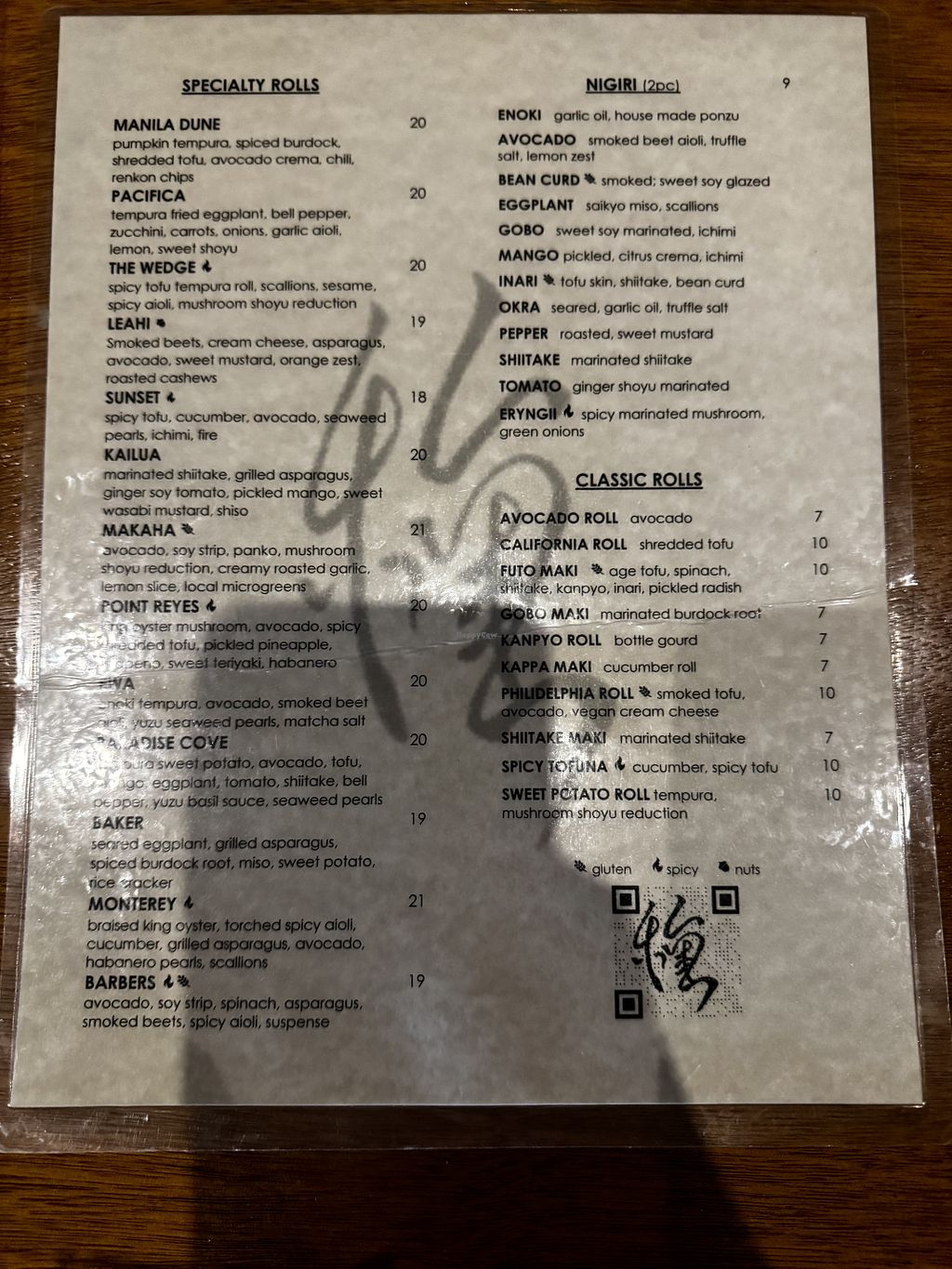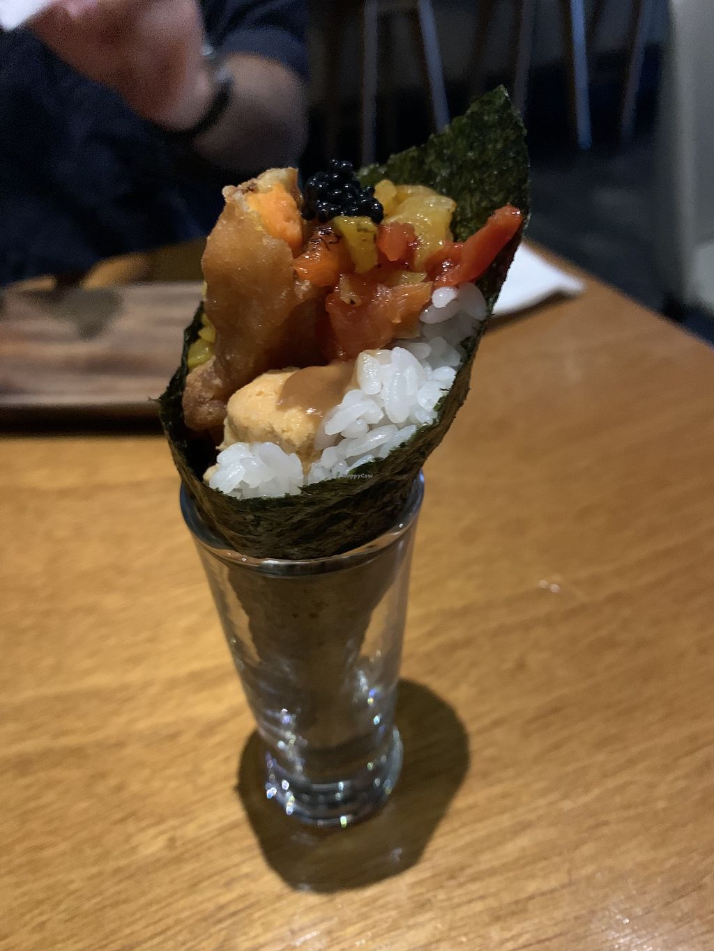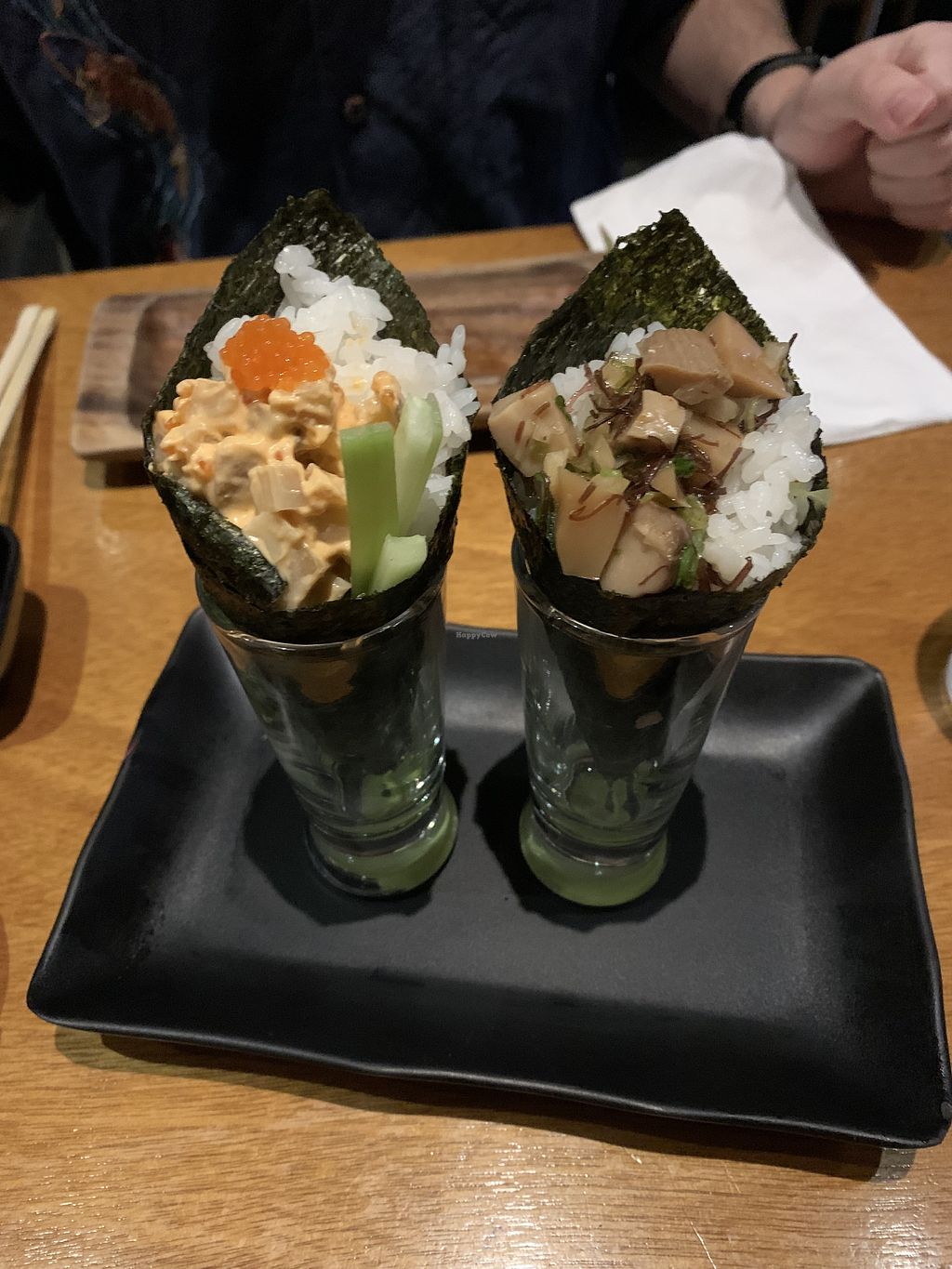 Fully vegan sushi experience. We enjoyed it and would recommend it. If you're a sushi buff you may be disappointed in the flavors and textures of the roll. A bit pricey, but interesting foods and cocktails.