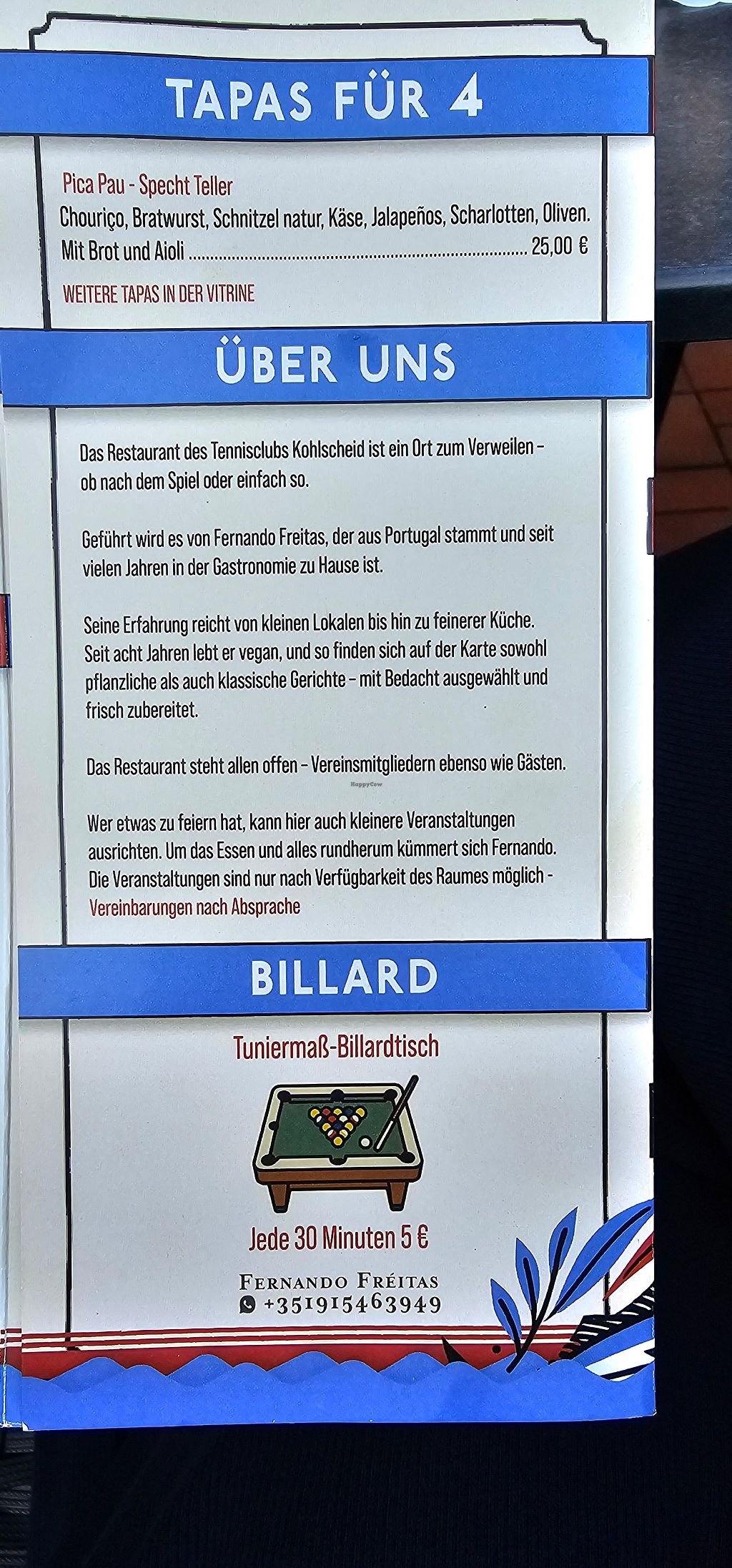 Serves meat, vegan options available. Restaurant and bar inside the tennis club Kohlscheid. Vegan choices are clearly labeled, including burger, tapas, currywurst, toasts and schnitzel. Also able to prepare made-to-order vegan cakes for special occasions and frozen snacks to bake at home. Phone: +351915463949. Open Mon-Sat 18:00-22:00, Sun 12:00-20:00. Hours are subject to season - call ahead.