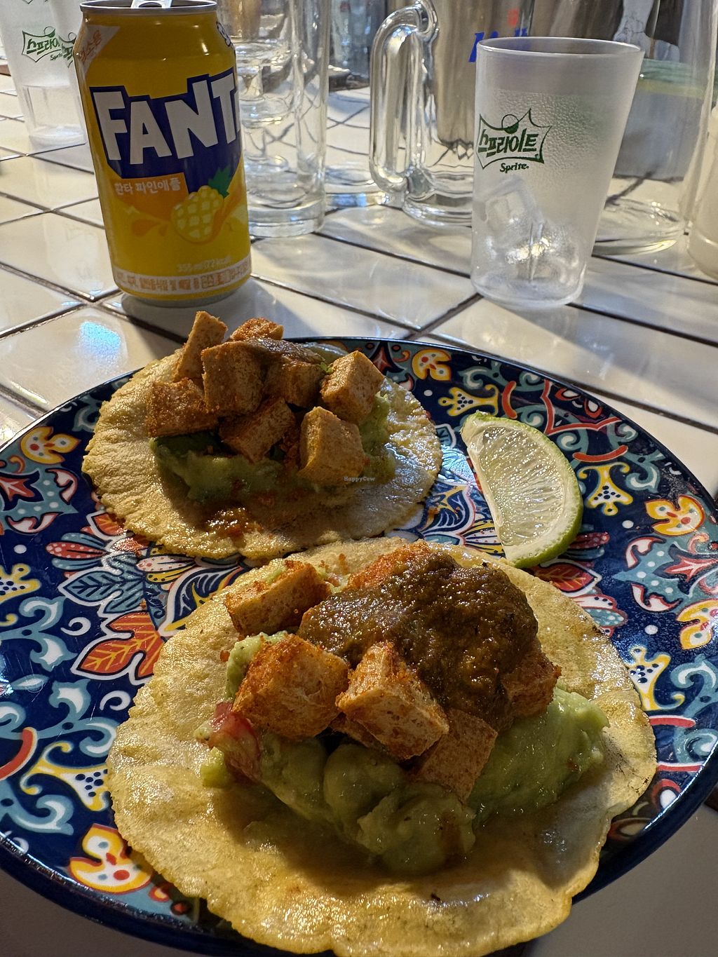 Small Mexican restaurant in Busan. They have two vegan options on the menu: tofu tacos and nachos with guacamole.