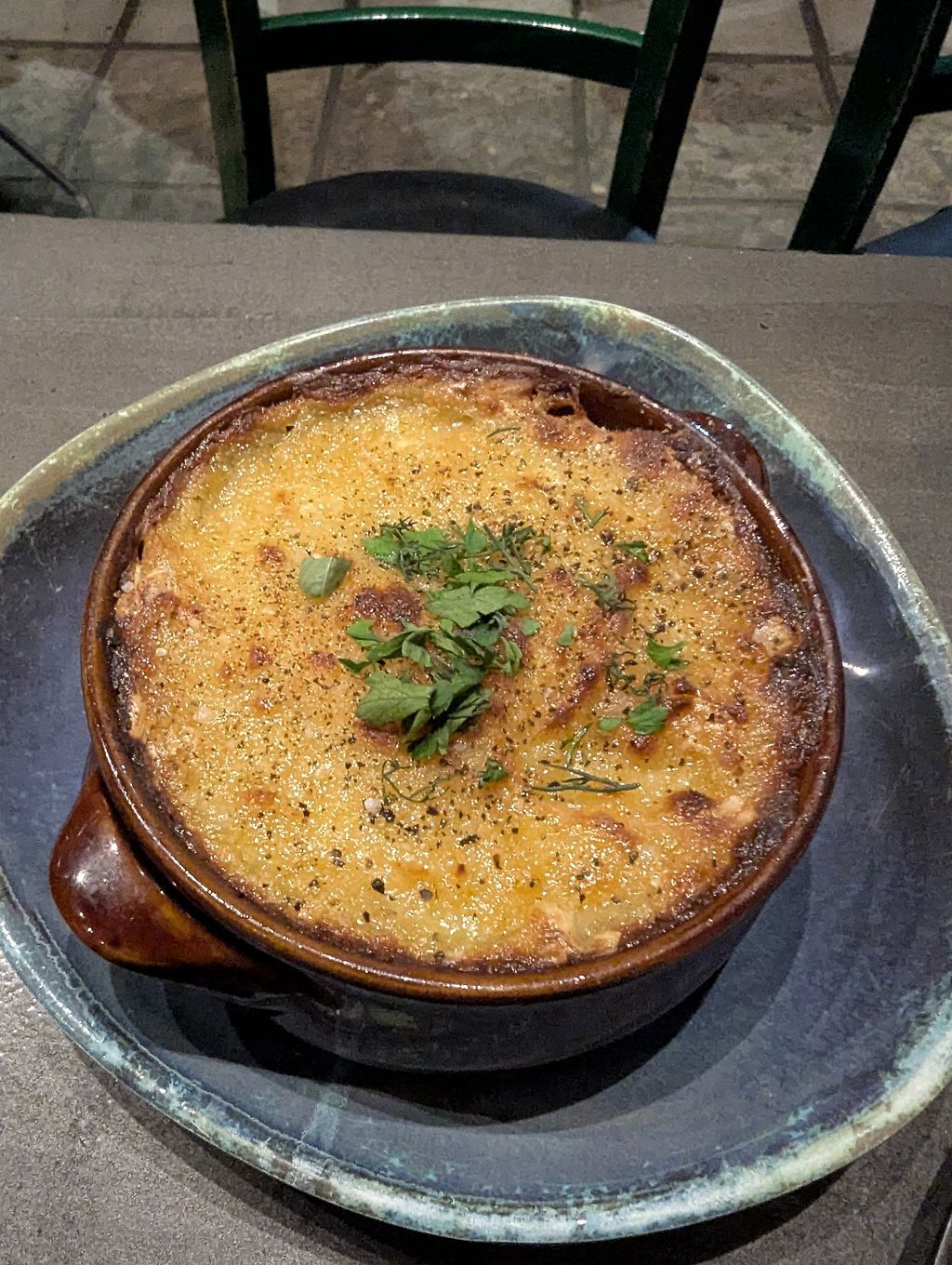 Wow! The food was amazing. It was really fresh, flavorful, and beautifully plated. It was also quite filling and inexpensive. I loved everything we had; the lemony mushrooms, Spetsofal - seitan sausage, peppers, tomatoes, and onions, Bouglourdi -spicy dip with feta, Parmesan, tomatoes , and the Pastitsio. All came with bread, was beautifully prepared and simply amazing! Sat outside but the inside was very cute. The staff were really nice and helpful.