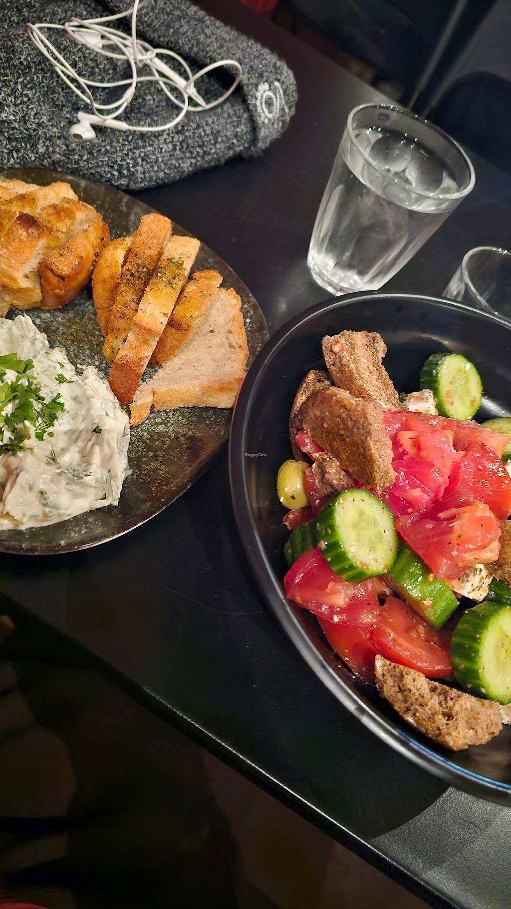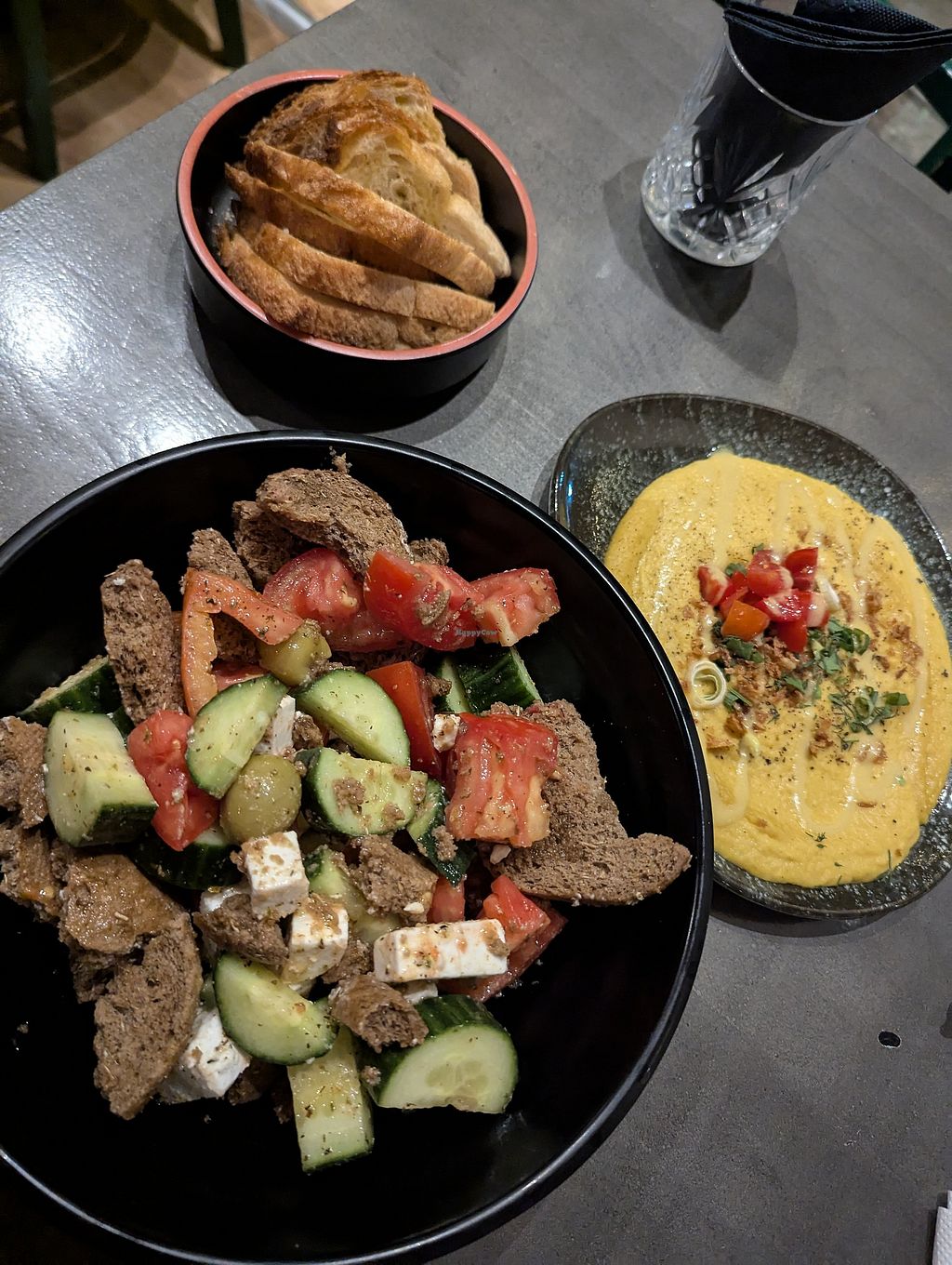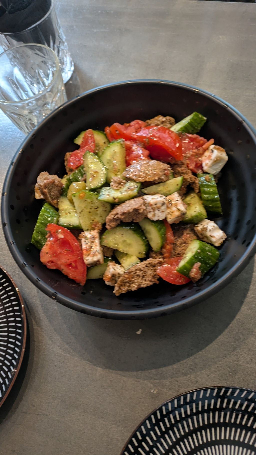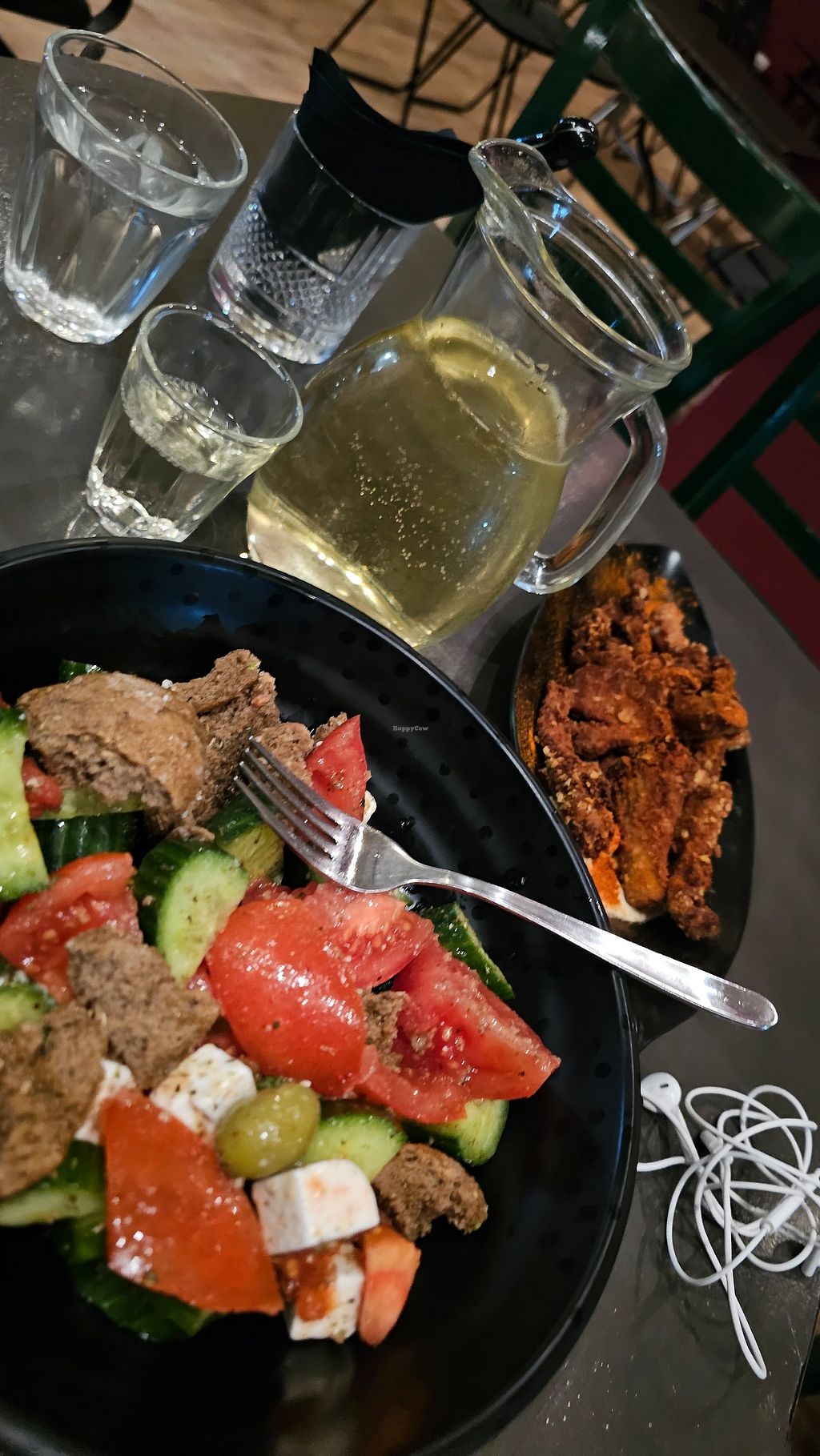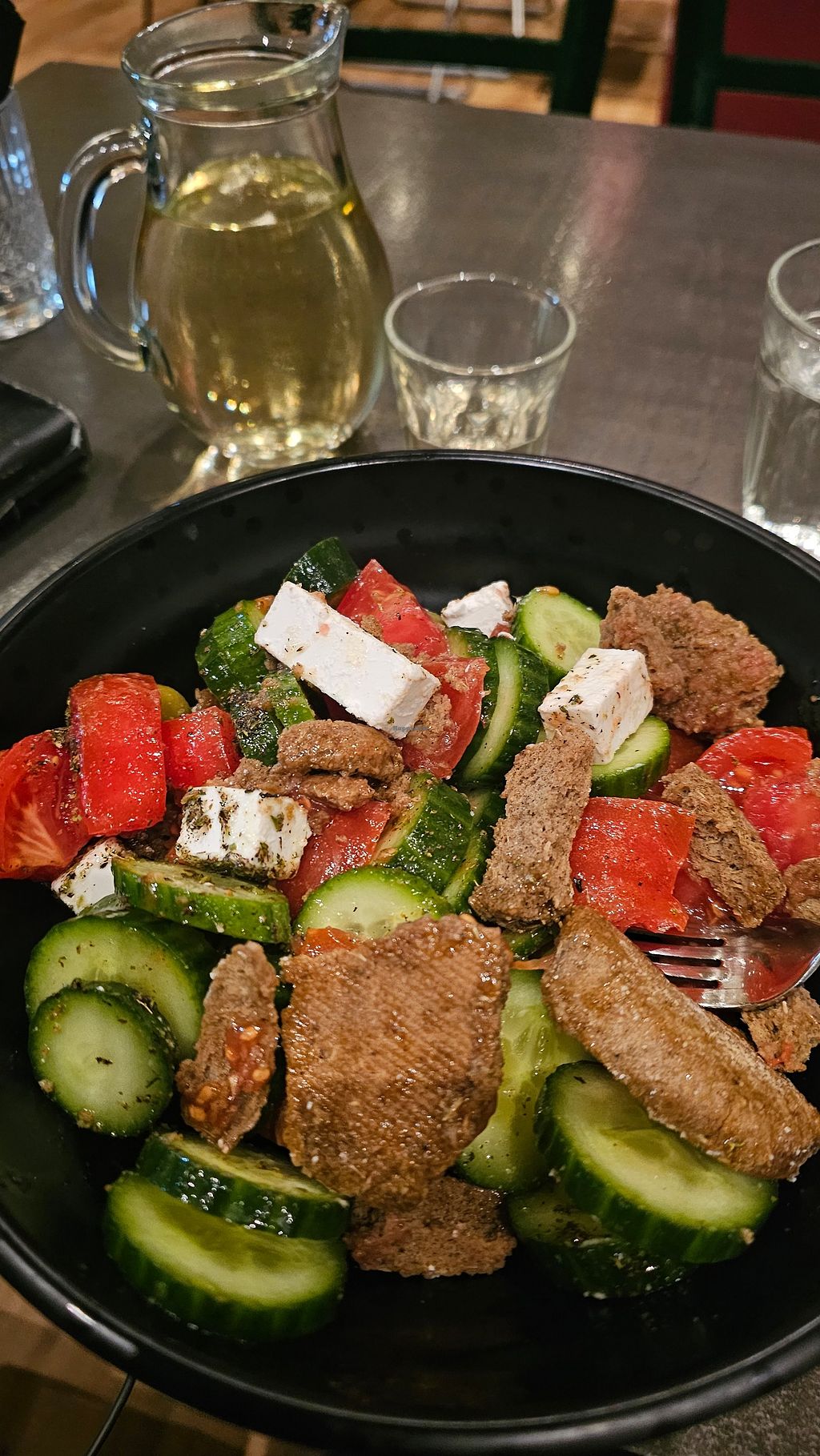 All vegan greece dishes. We ordered a lot and everything was really really good! My facorit is the greek salad. The people were super friendly and there was even a dog from the owners chillin 🥰