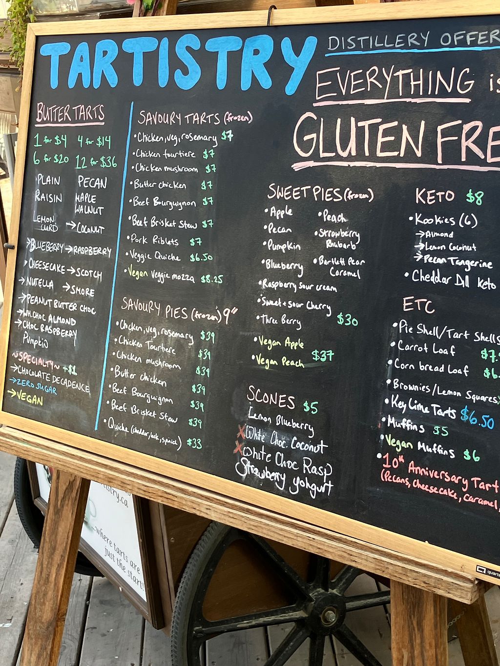 We happened across Tartistry in the brewery district and were surprised to see they had gluten free vegan butter tarts, in addition to some other vegan gluten free baked goods. The butter tarts came in 3 kinds: regular; with raisins; with mini chocolate chips. We tried a regular one and a chocolate chip. Both were really good. The filling was thicker than I remember butter tarts being, and the chocolate chips took a bit if the sweetness out. The bakery is definitely worth checking out. Other vegan gluten free items on their menu included muffins, pies and savoury tarts.