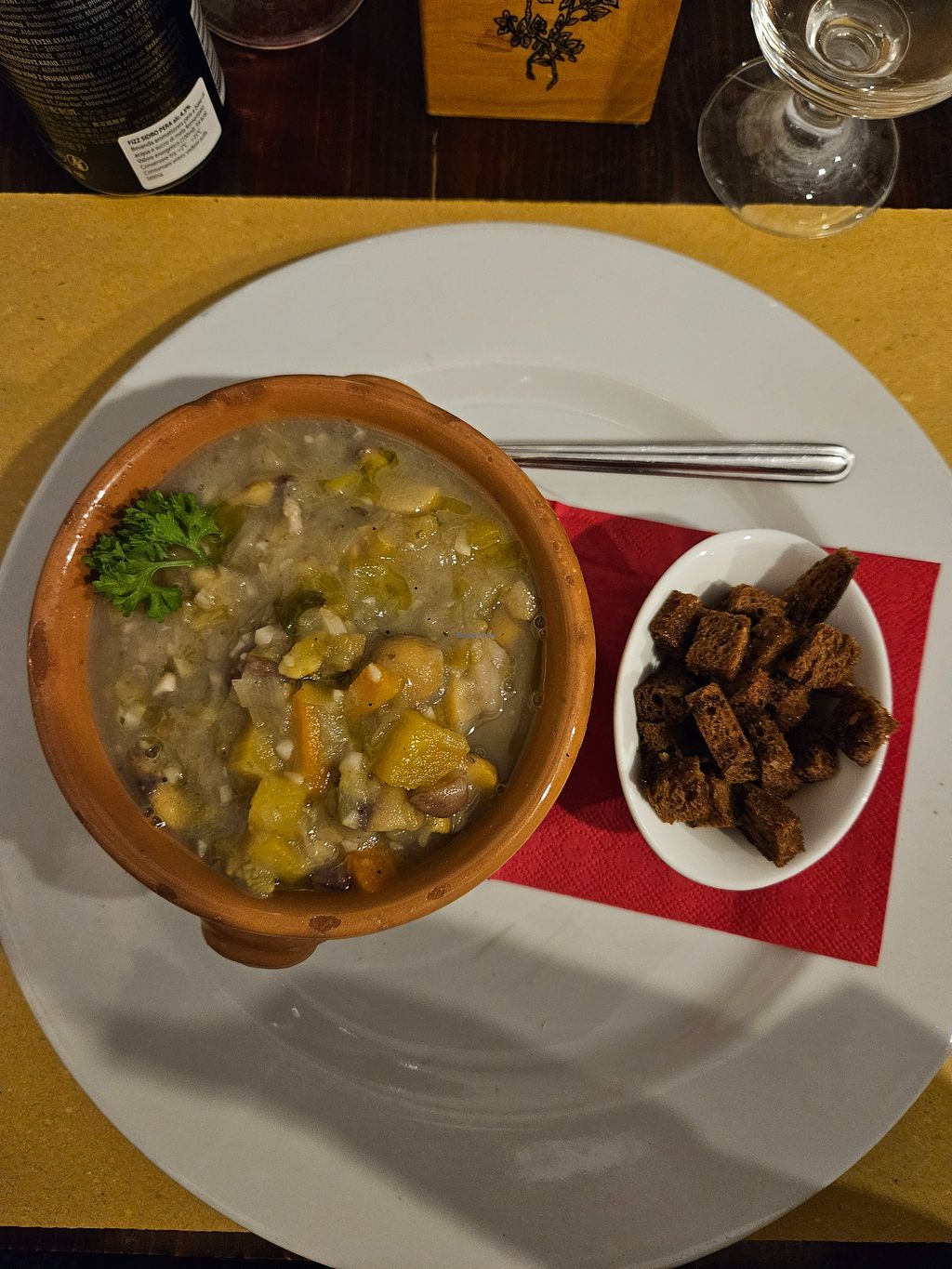 Serves meat, vegan options available. Medieval tavern with some vegan options. Allergens are listed in the menu. Vegan options include bruschetta (ask for vegan version), fagioli del dimonio, salads, and more. Open Mon-Fri 18:30-00:00, Sat 18:30-01:30. Closed Sun.