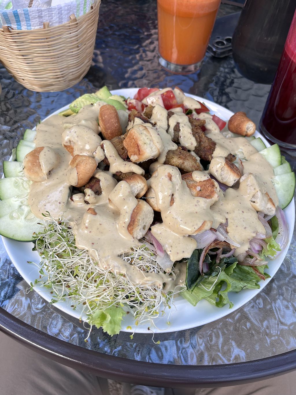 Fully vegan which is nice. Had the 3 seitan tacos and the taco al pastor. All were a little bland but the al pastor was definitely better than the others. My partner had a half portion of the alfredo pasta and some chips. They thoroughly enjoyed both. Apple, carrot and ginger juice was great and the brownie was also good. Lovely little outdoor courtyard with a lovely waitress.