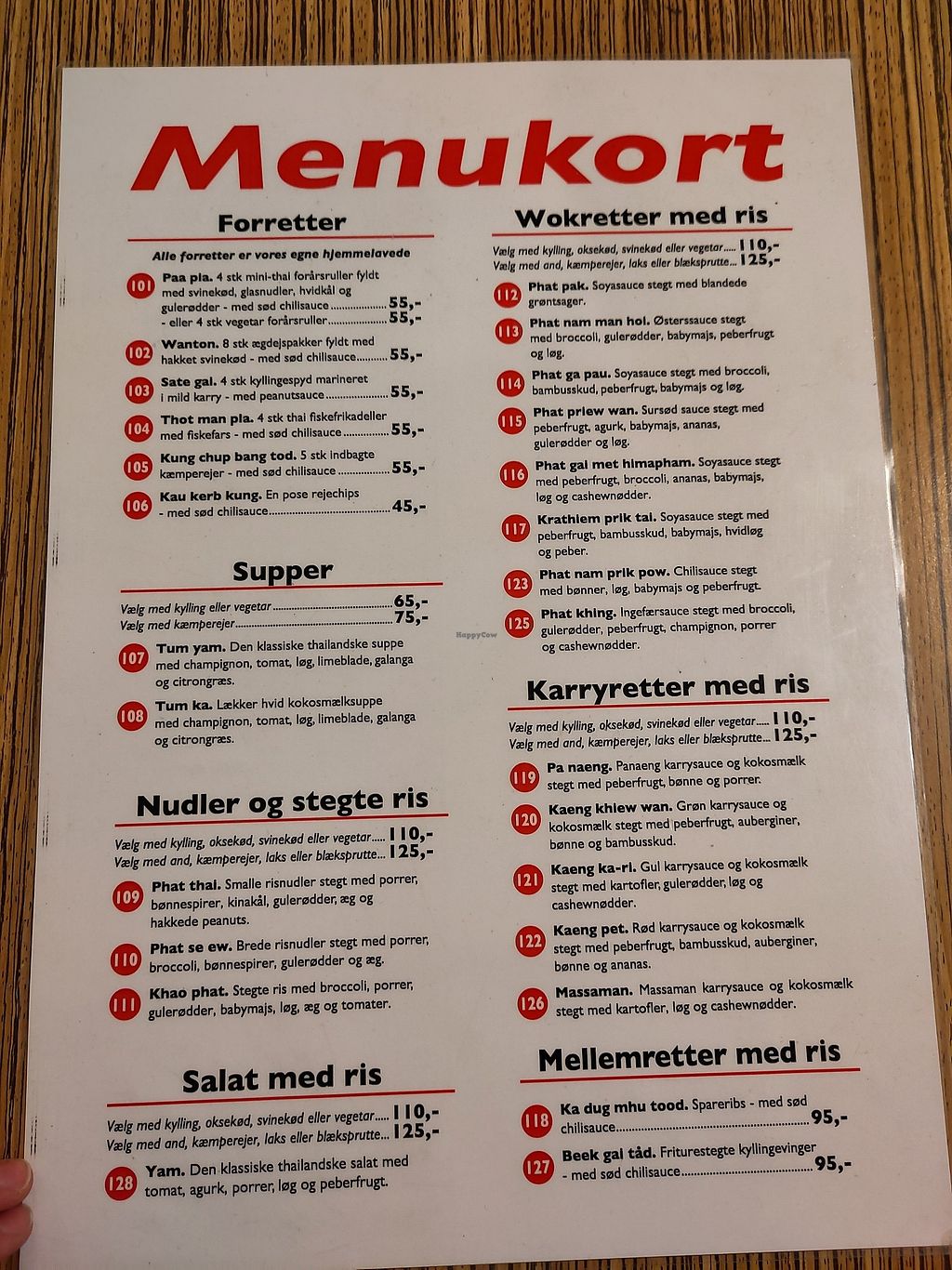 Serves meat, vegan options available. A small, authentic Thai takeaway and eatery located on Elmegade in Nørrebro. The kitchen offers a flexible menu where most classic dishes can be customized with tofu or vegetables instead of meat. Popular plant-based options include "Tum Ka" (coconut soup), "Phat Pak" (stir-fried vegetables), and "Phat Ga Pau" (basil stir-fry). Open Mon-Sun 14:30-21:00.
