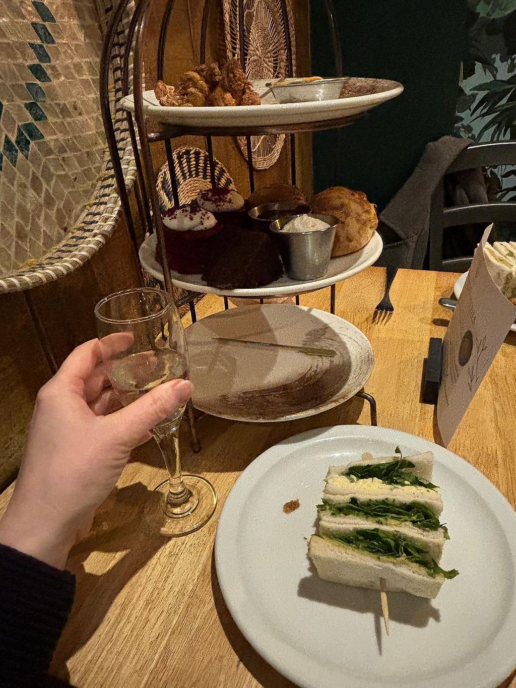 I came for a birthday afternoon tea with my Mum. The Cauliflower wings were a great addition to afternoon tea and the cakes and scones were delish 😍 the sandwiches however were all quite samey as they all had the same salad filling with only one slight difference between each sandwich, some more variation would have been nice. However for £16pp we can't complain!